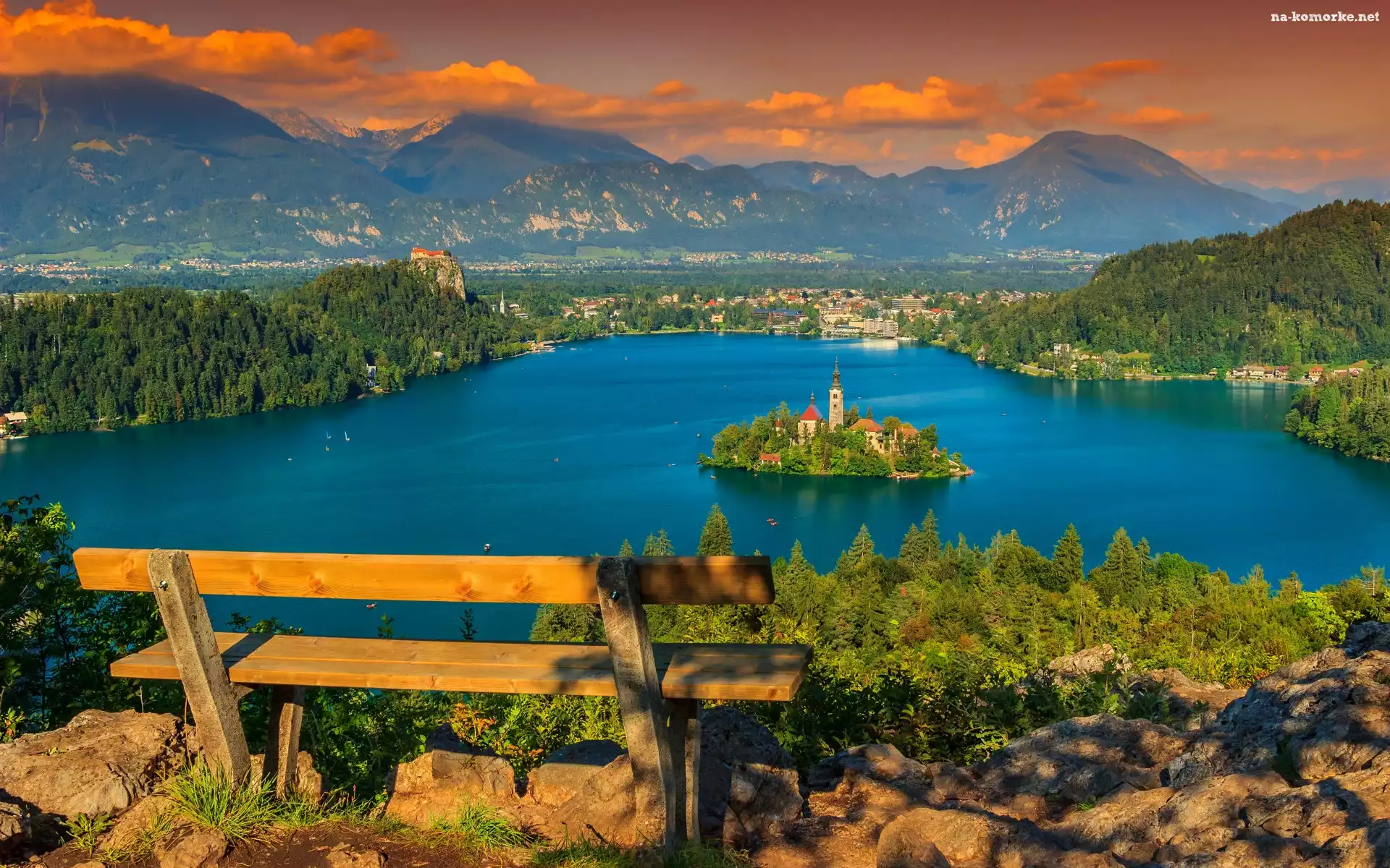 Słowenia, Góry, Ławka, Jezioro Bled, Wyspa Blejski Otok, Kościół, Zachód słońca na Komórkę
