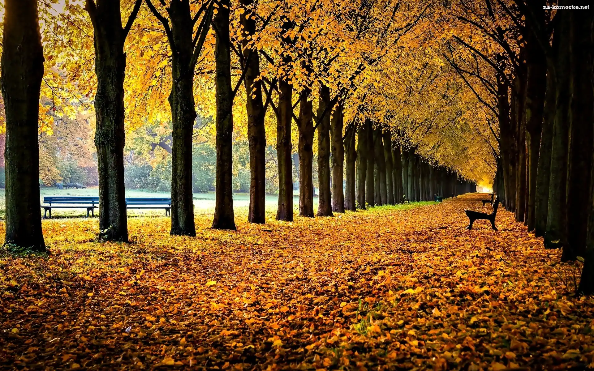 Ławki, Park, Jesień, Drzewa, Aleja, Liście na Komórkę