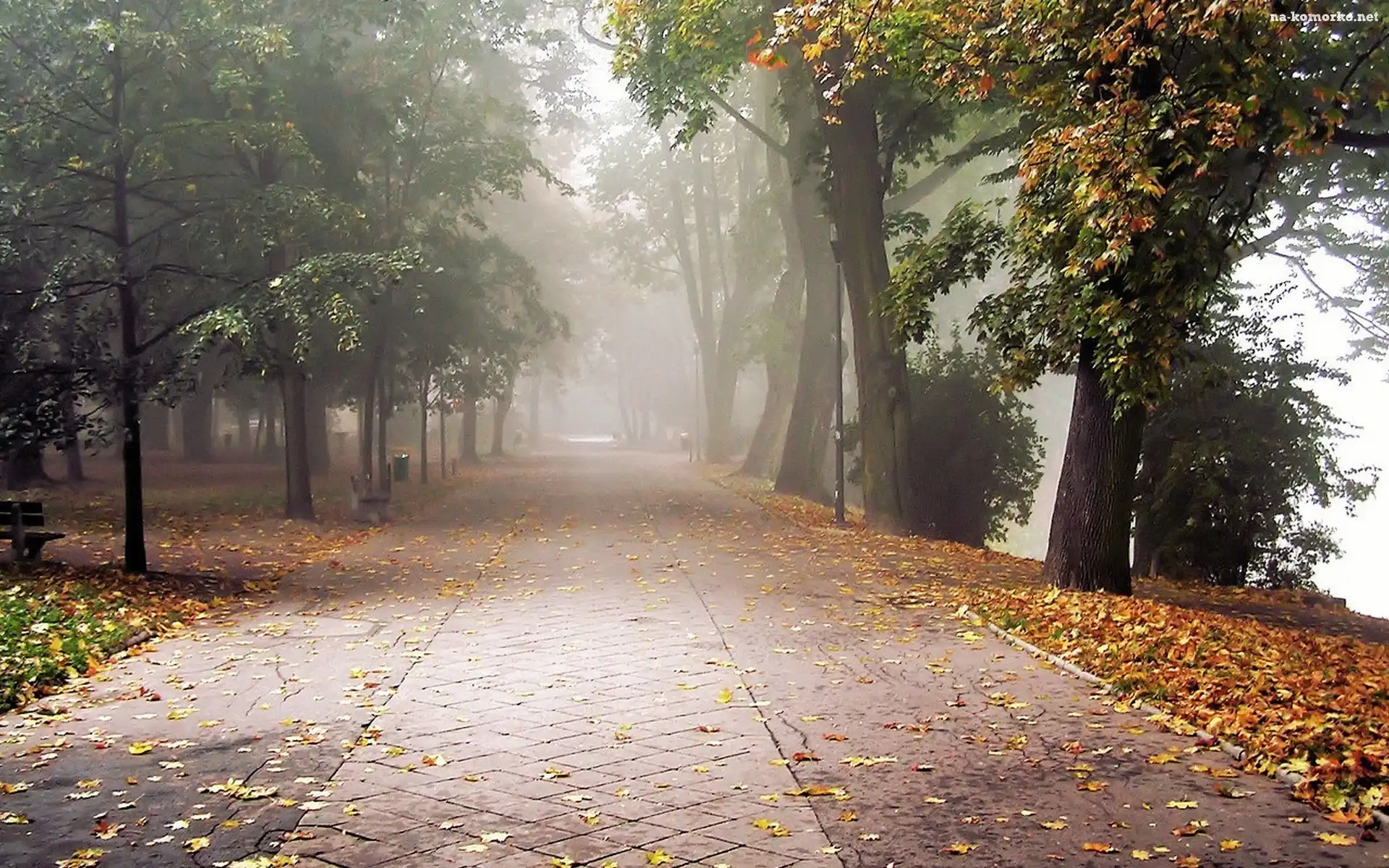 Ławki, Chodnik, Park, Mgła, Drzewa, Liście na Komórkę