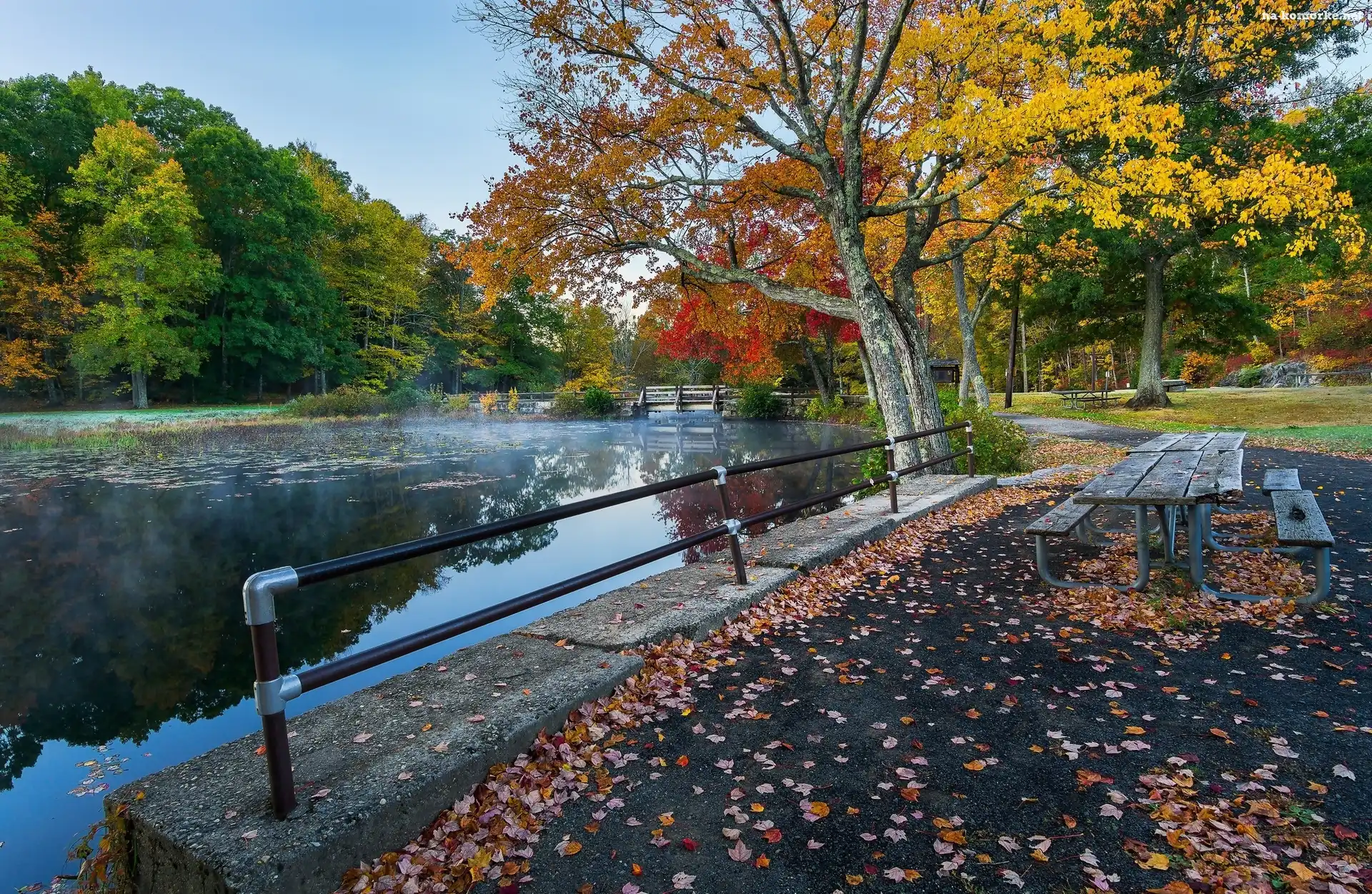 Jesień, Ławki, Staw, Park, Liście, Mostek, Stół na Komórkę