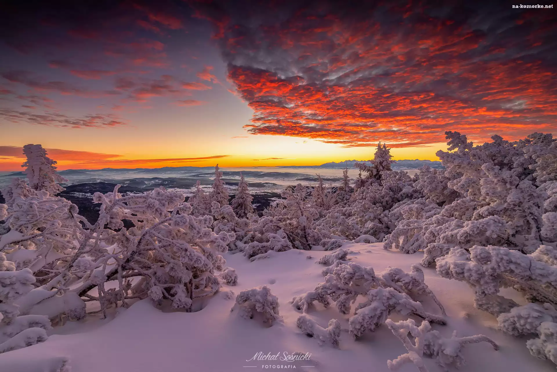 Wschód słońca, Niebo, Polska, Krzewy, Śnieg, Drzewa, Zima, Chmury, Babiogórski Park Narodowy na Komórkę |