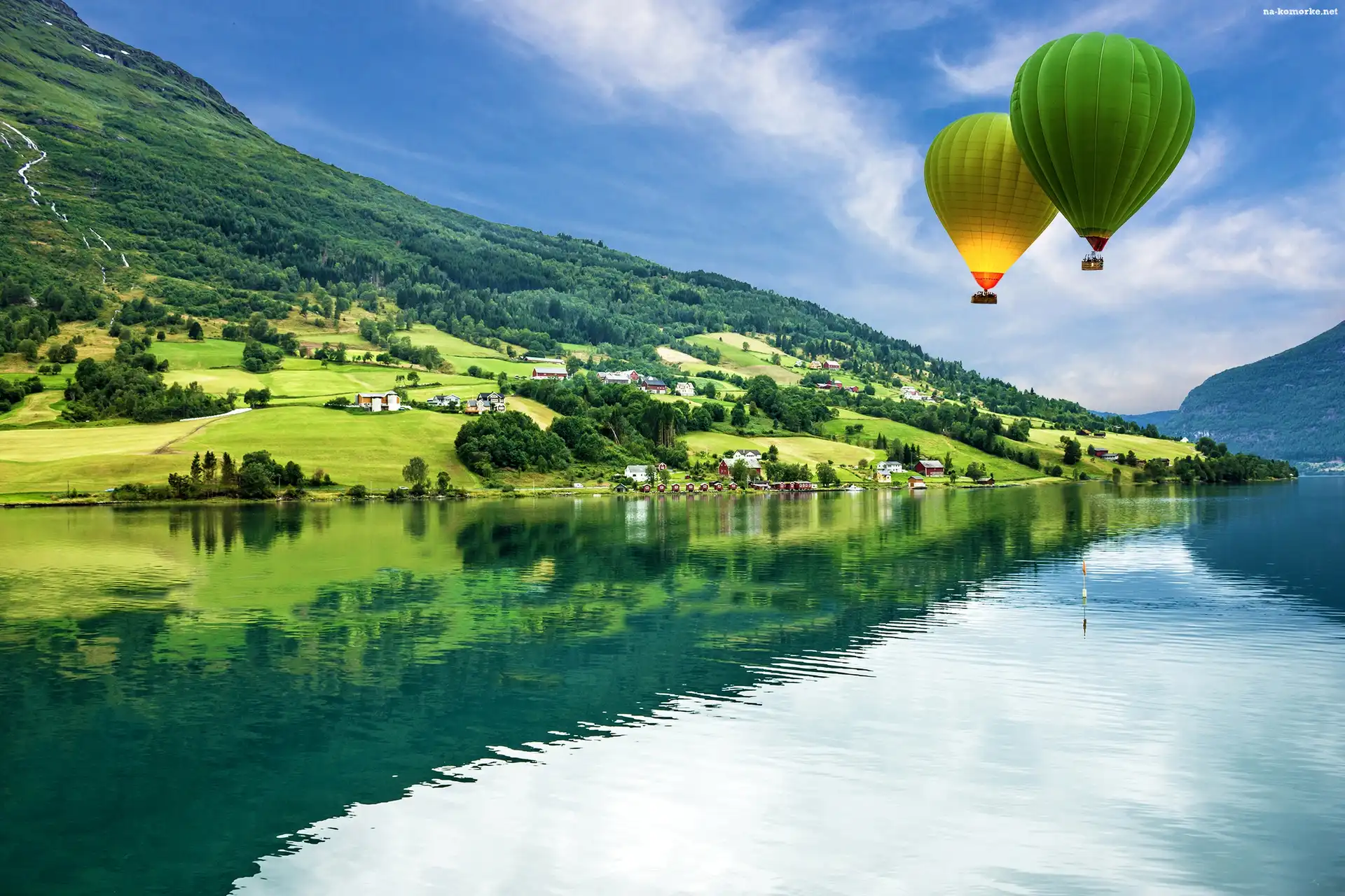Balony, Góry, Domy, Roślinność, Rzeka na Komórkę