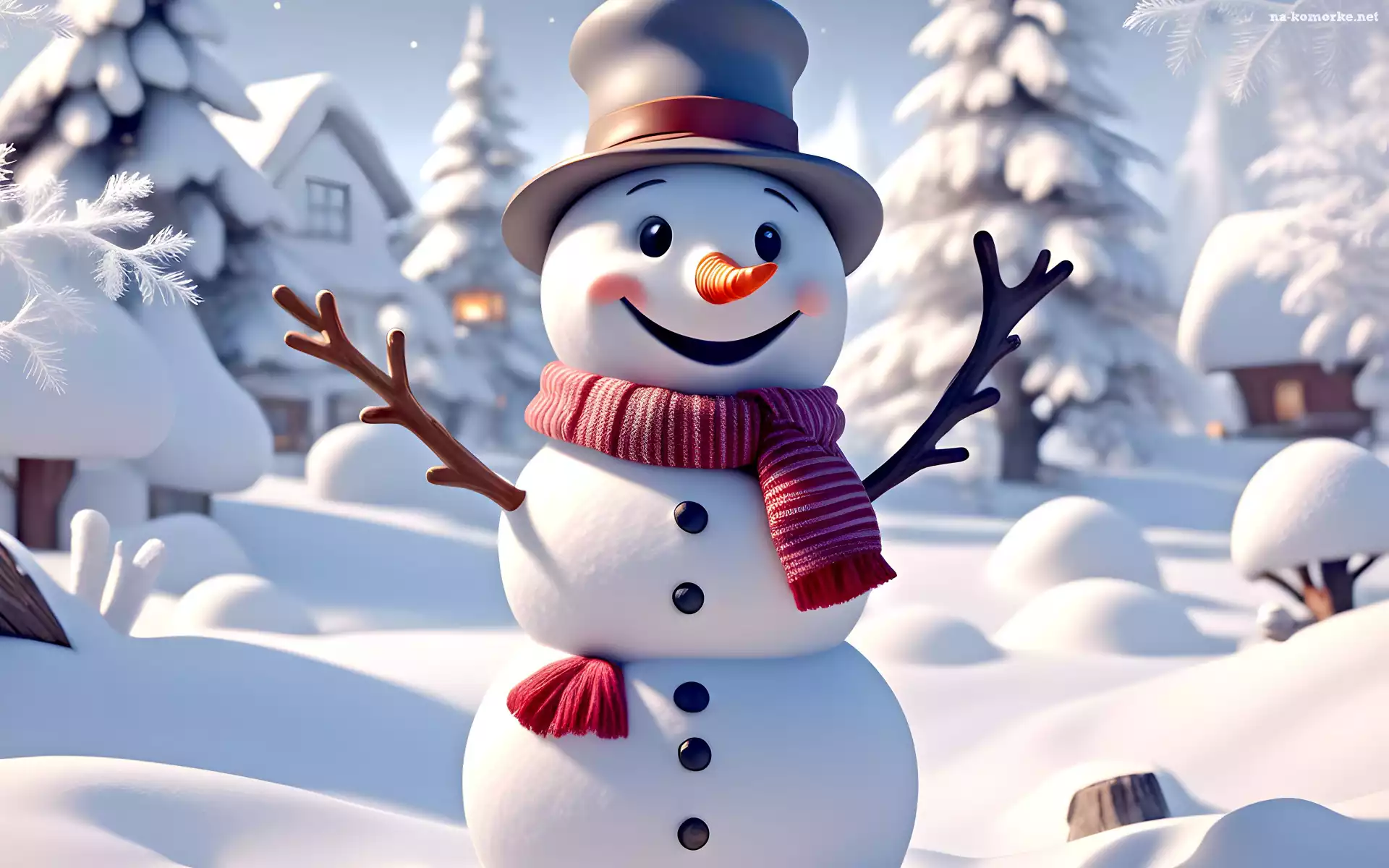 Uśmiech, Śnieg, Czapka, Zima, Drzewa, Dom, Szalik, Bałwan na Komórkę