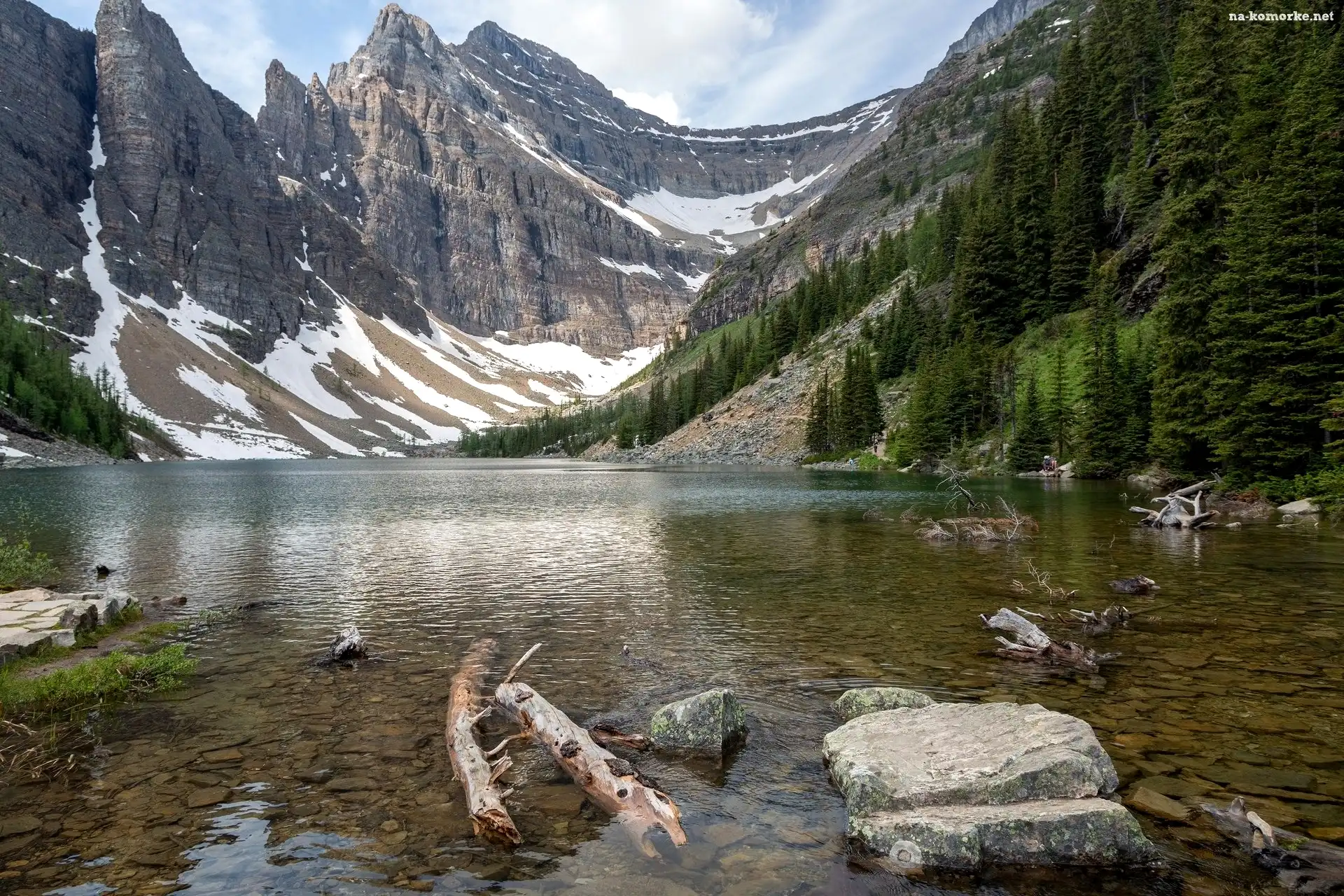 Góry, Prowincja Alberta, Park Narodowy Banff, Kanada, Jezioro Agnes, Drzewa, Kamienie, Śnieg na Komórkę |