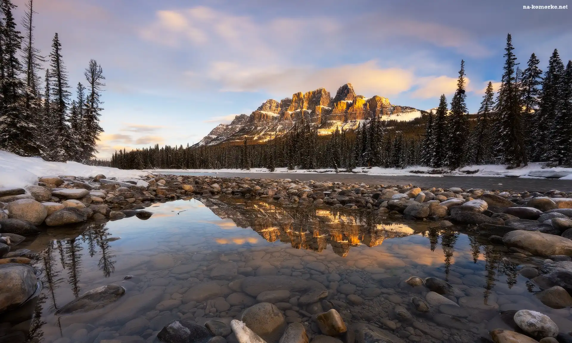 Las, Castle Mountain, Kanada, Canadian Rockies, Kamienie, Bow River, Góra, Rzeka, Chmury, Zima, Góry, Park Narodowy Banff, Drzewa, Alberta na Komórkę |