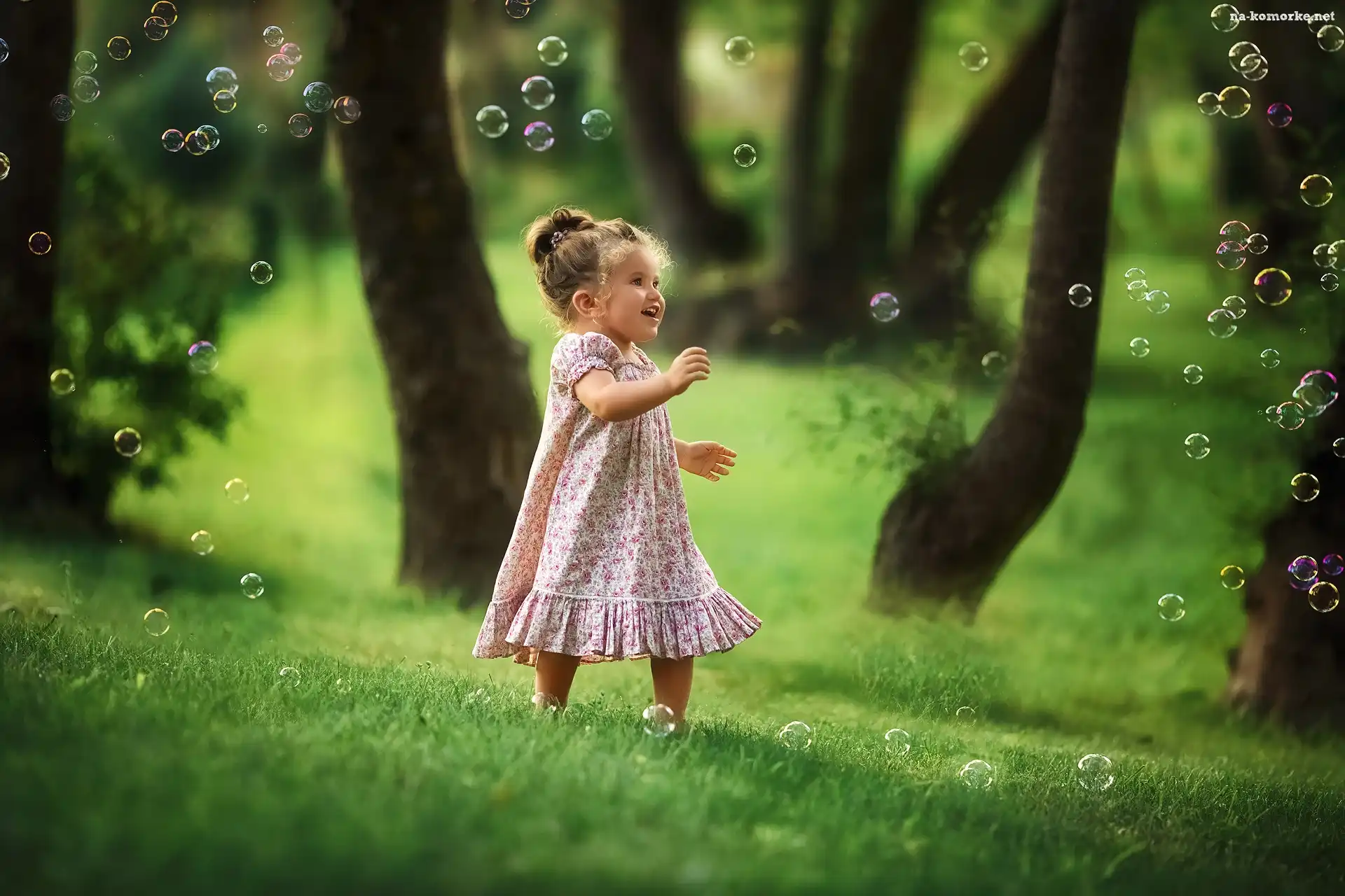 Dziecko, Bańki, Mydlane, Dziewczynka, Las, Drzewa, Trawa na Komórkę