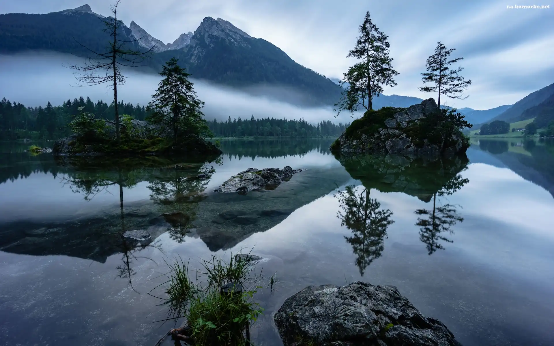 Jezioro Hintersee, Drzewa, Niemcy, Alpy, Bawaria, Gmina Berchtesgadener, Góry, Skały, Kamienie, Mgła na Komórkę |