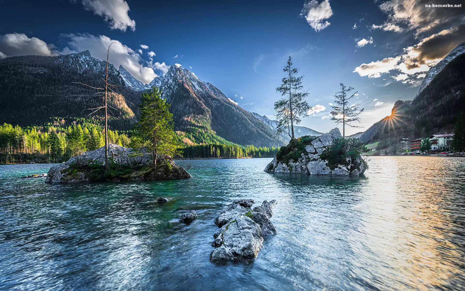 Dom, Wysepki, Chmury, Jezioro Hintersee, Góry, Bawaria, Niemcy, Drzewa, Promienie słońca na Komórkę |