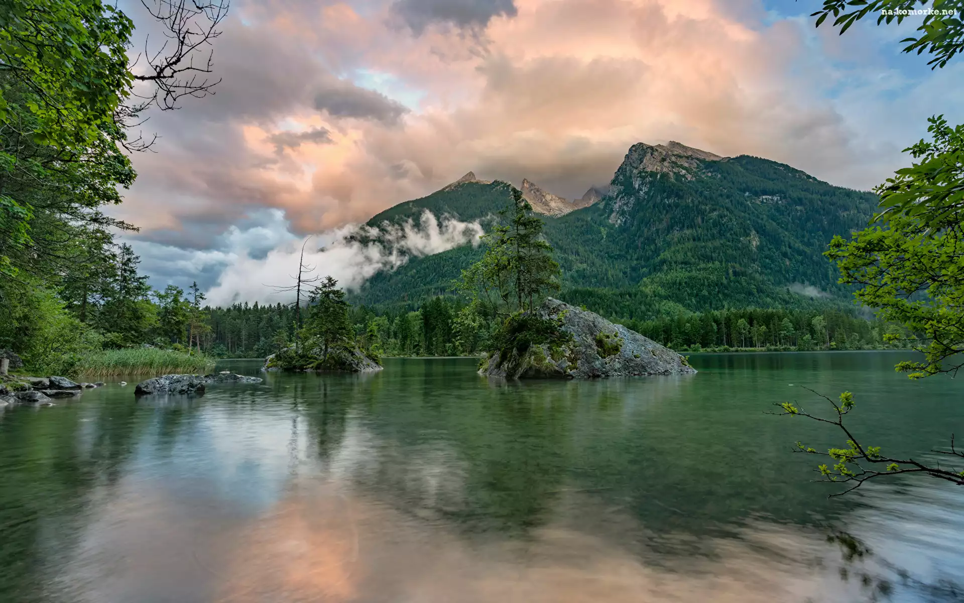 Skały, Drzewa, Niemcy, Góry, Berchtesgaden, Jezioro Hintersee, Bawaria na Komórkę
