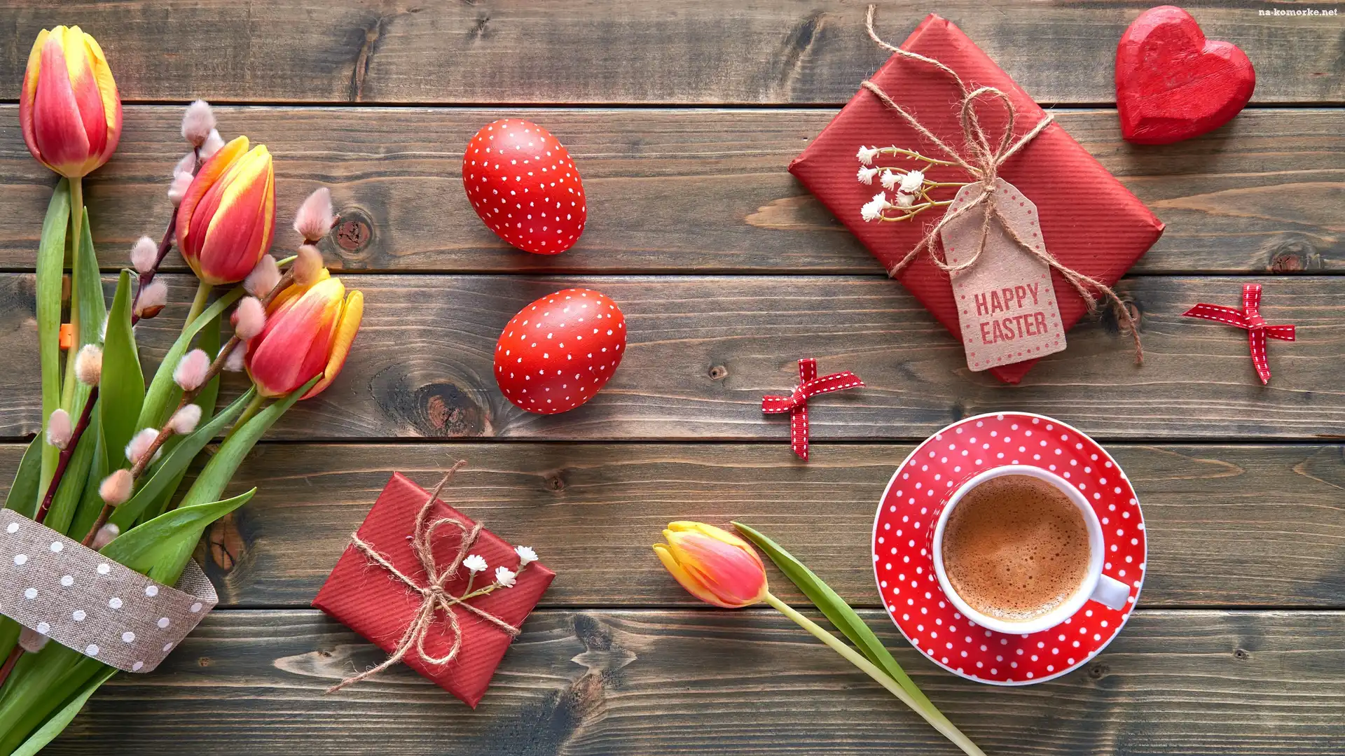Pisanki, Kompozycja, Kawa, Tulipany, Deski, Wielkanoc, Prezenty, Bazie na Komórkę