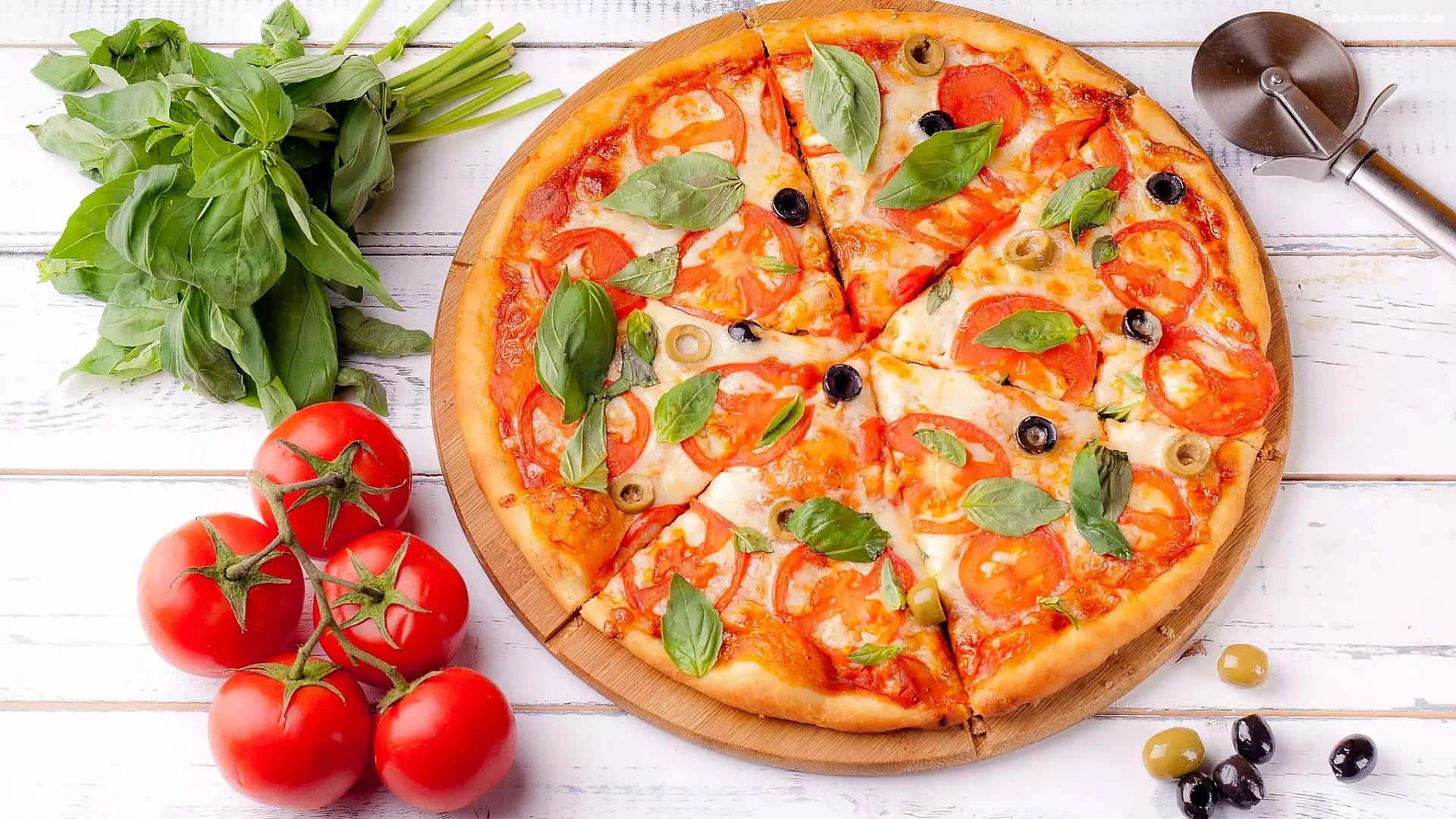 Bazylia, Pizza, Deska, Pomidory, Oliwki na Komórkę