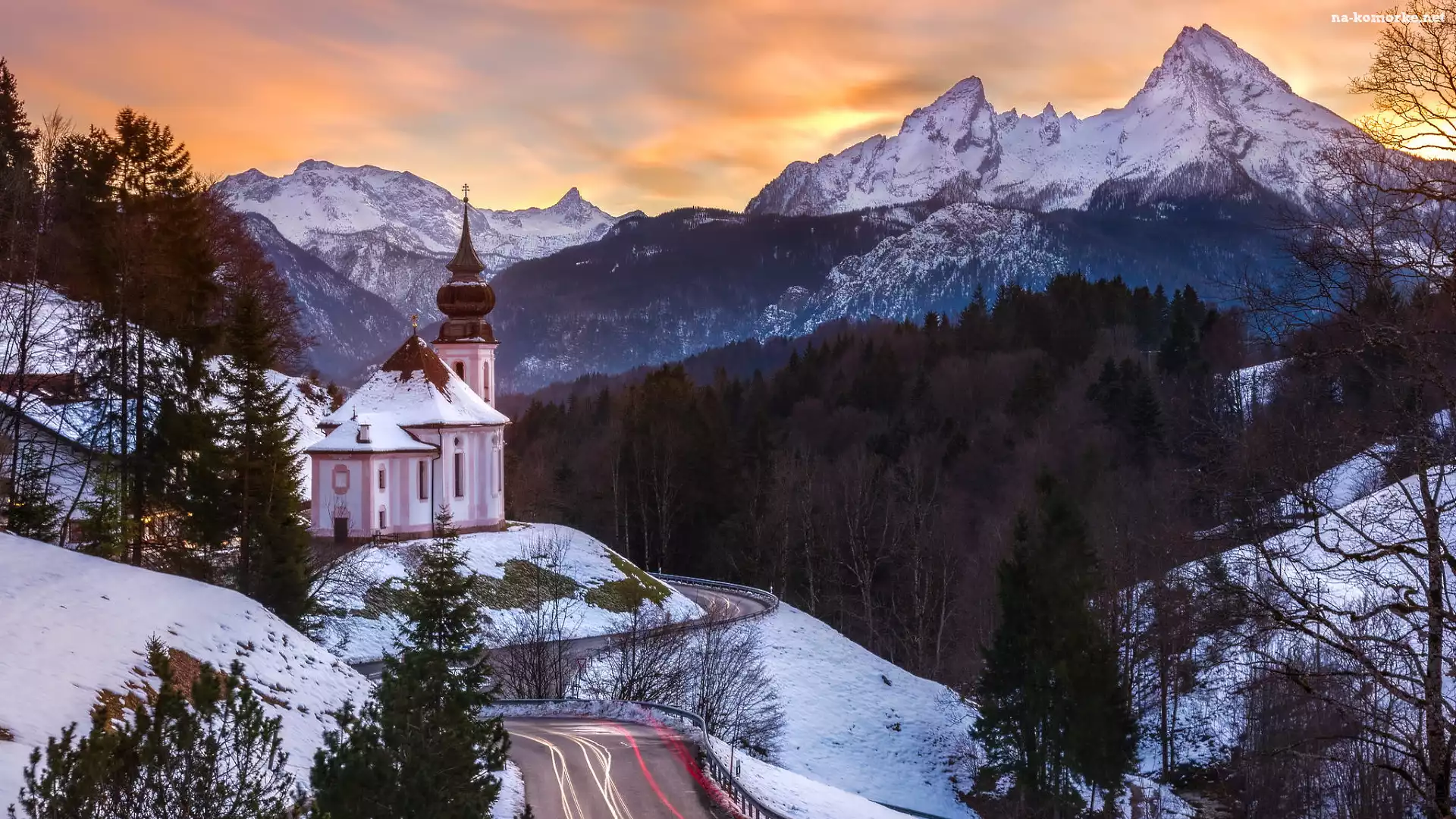 Berchtesgaden, Wschód słońca, Kościół, Alpy Salzburskie, Niemcy, Góry, Drzewa, Bawaria, Sanktuarium Maria Gern, Lasy, Droga, Zima na Komórkę |