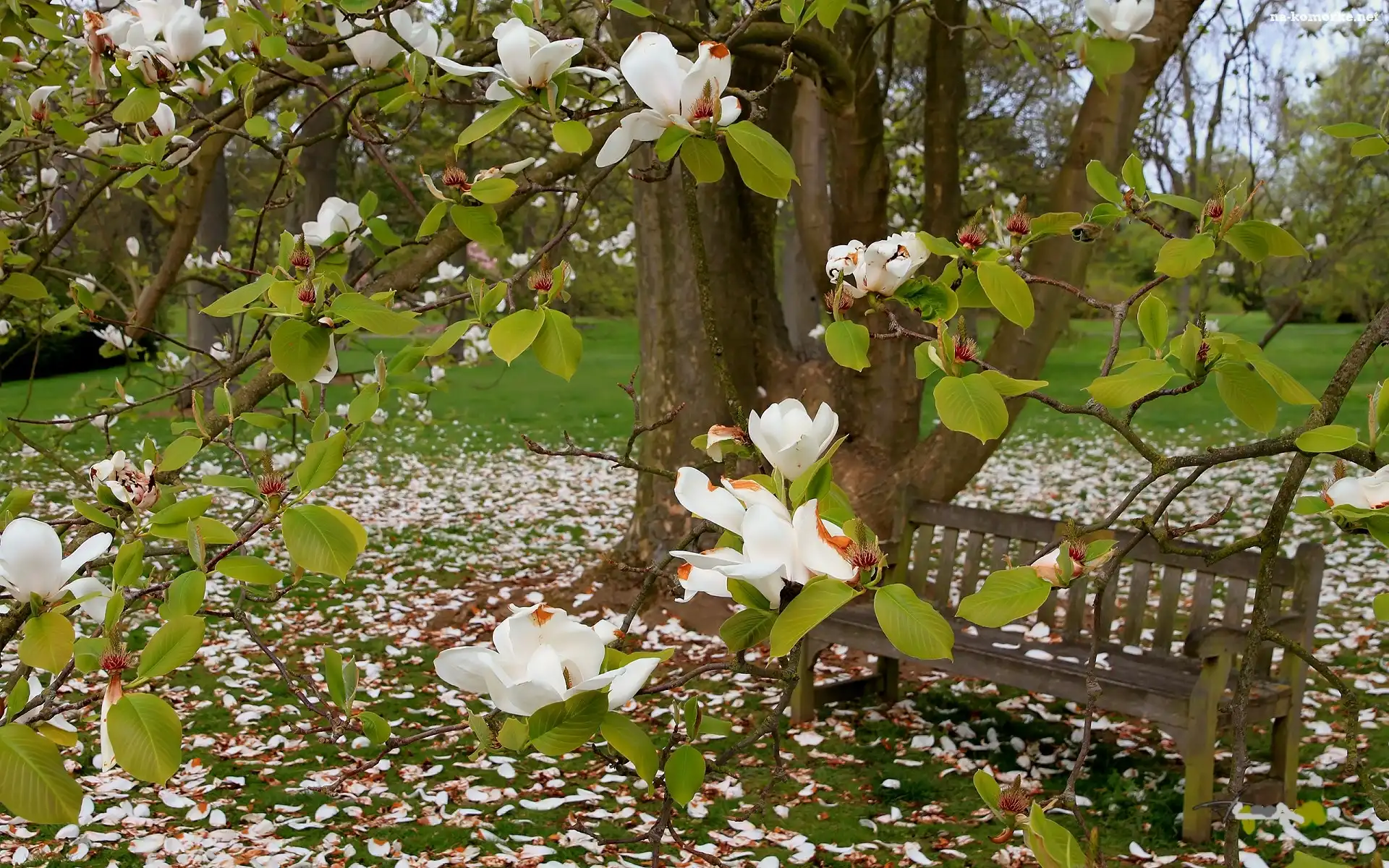 Ławeczka, Wiosna, Park, Biała, Magnolia na Komórkę