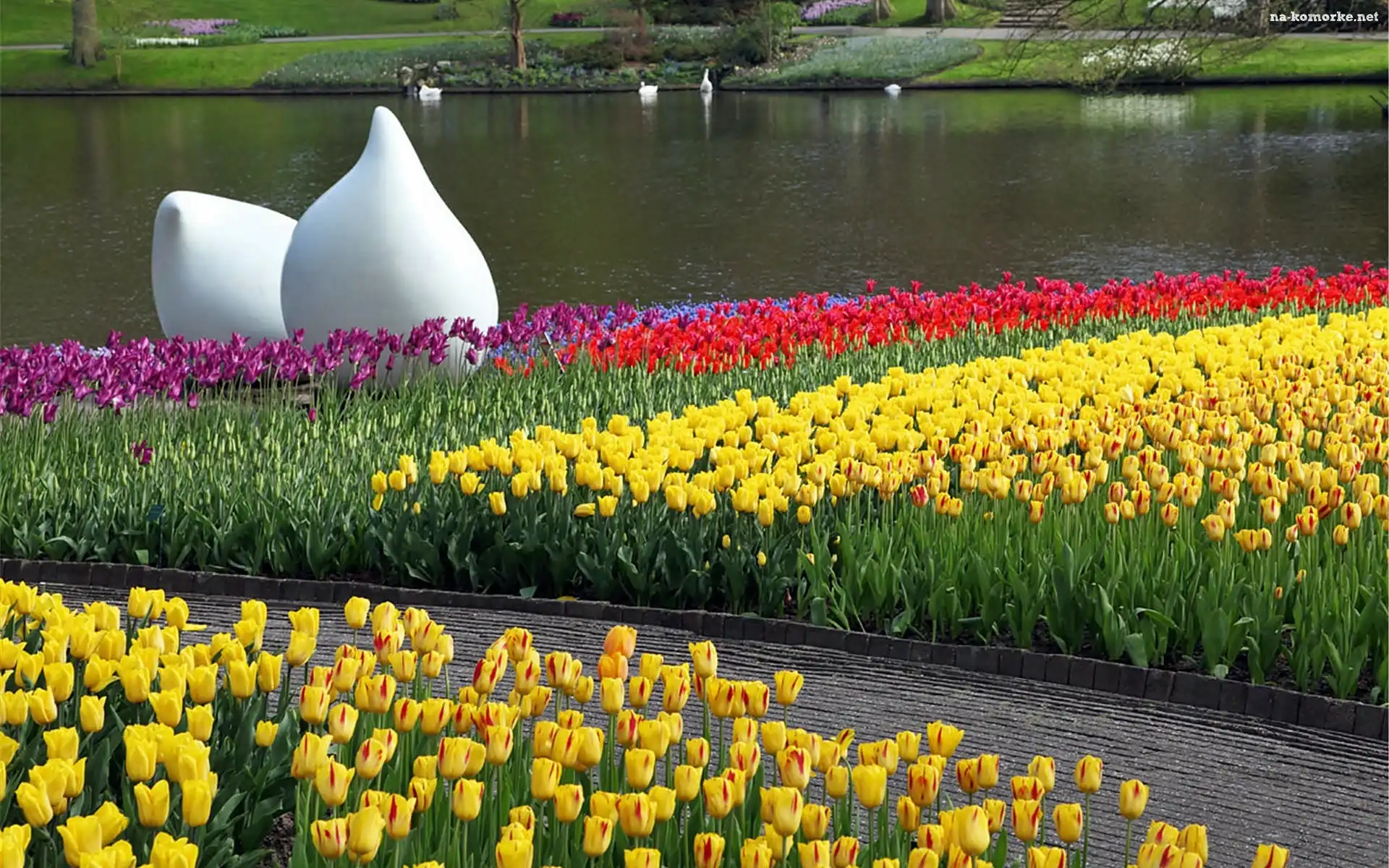 Wiosna, Biała, Rzeźba, Park, Staw, Kwitnące, Tulipany na Komórkę