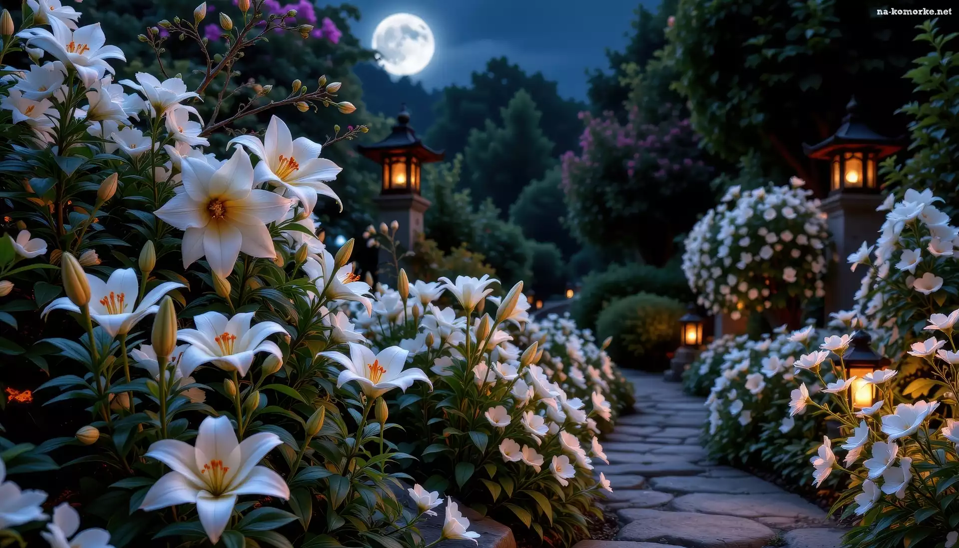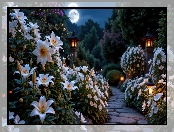 Księżyc, Ogród, Kwiaty, AI, Lilie, Latarnie. Ścieżka, Białe na Komórkę