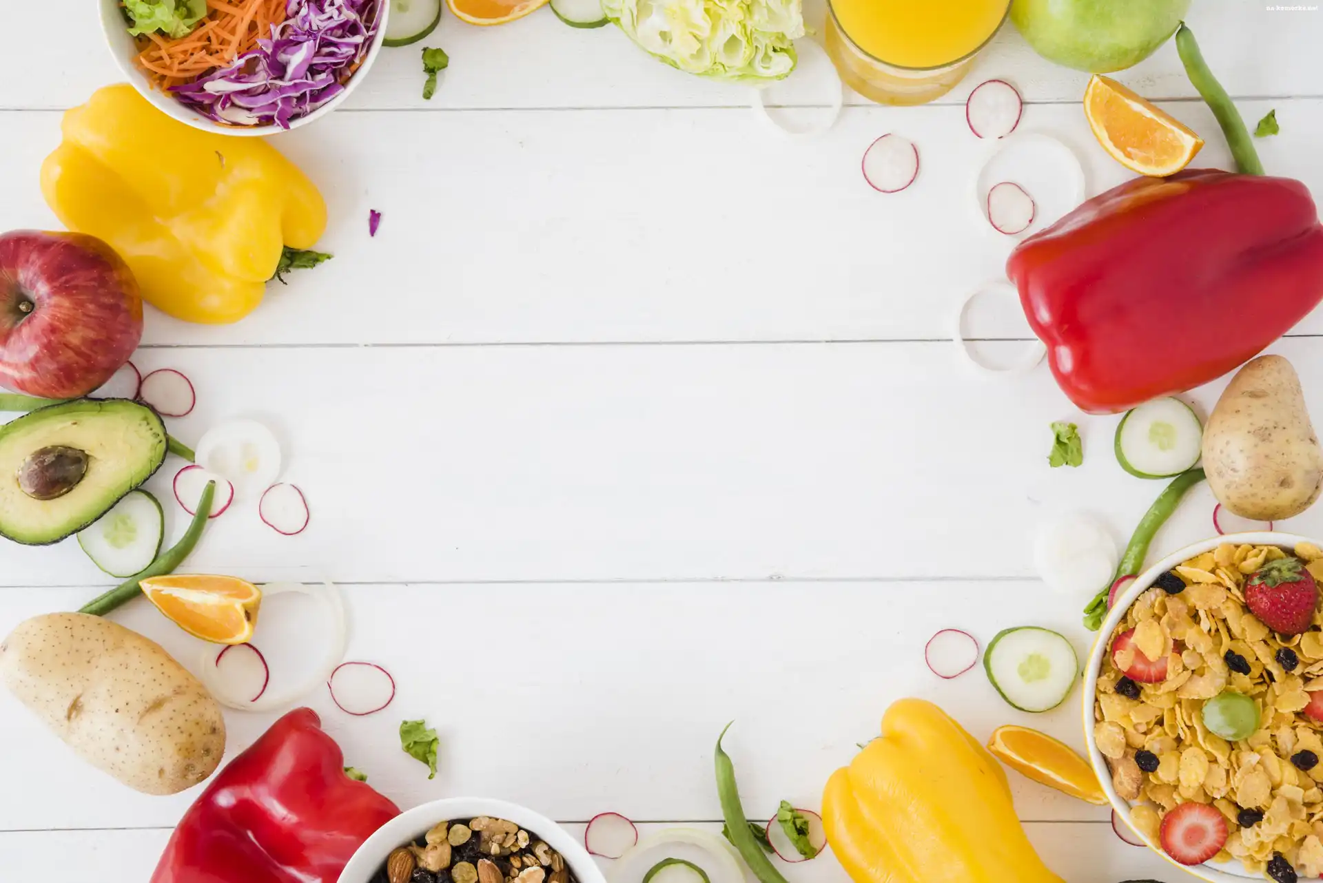 Warzywa, Deski, Papryki, Kompozycja, Owoce, Płatki kukurydziane, Miska, Białe na Komórkę