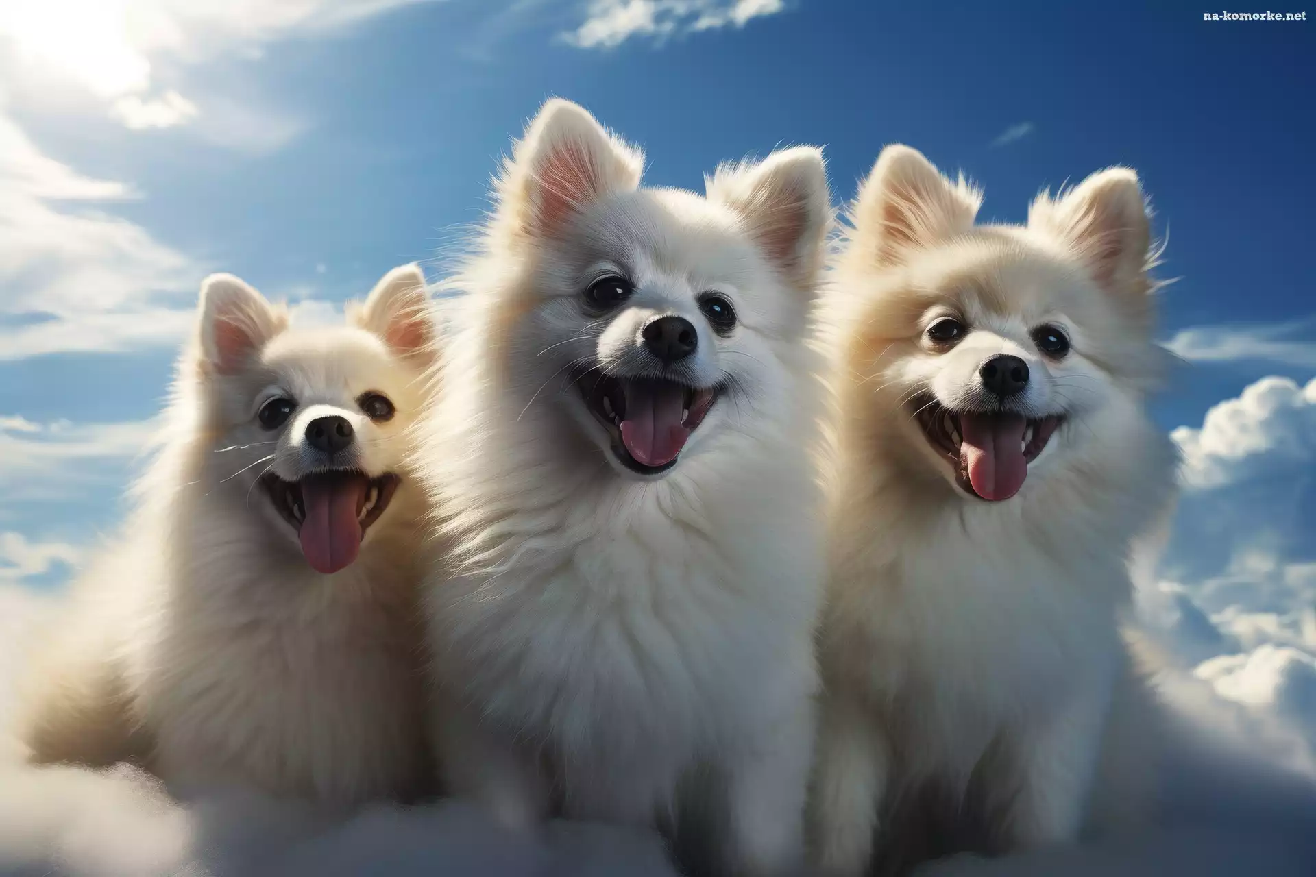 Niebo, Chmury, Trzy, Grafika, Psy, Szpice miniaturowe, Białe na Komórkę