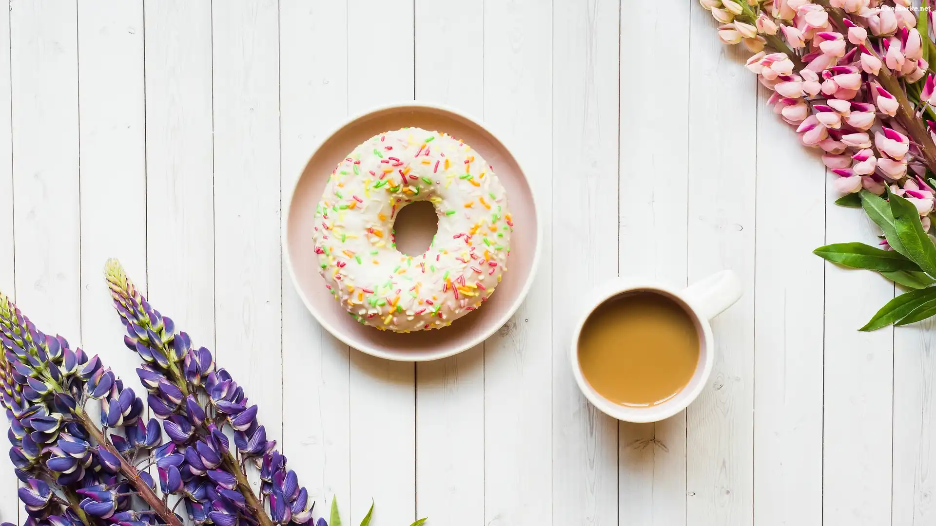 Pączek, Białe, Kubek, Deski, Donut, Kawa, Kwiat, Łubin na Komórkę