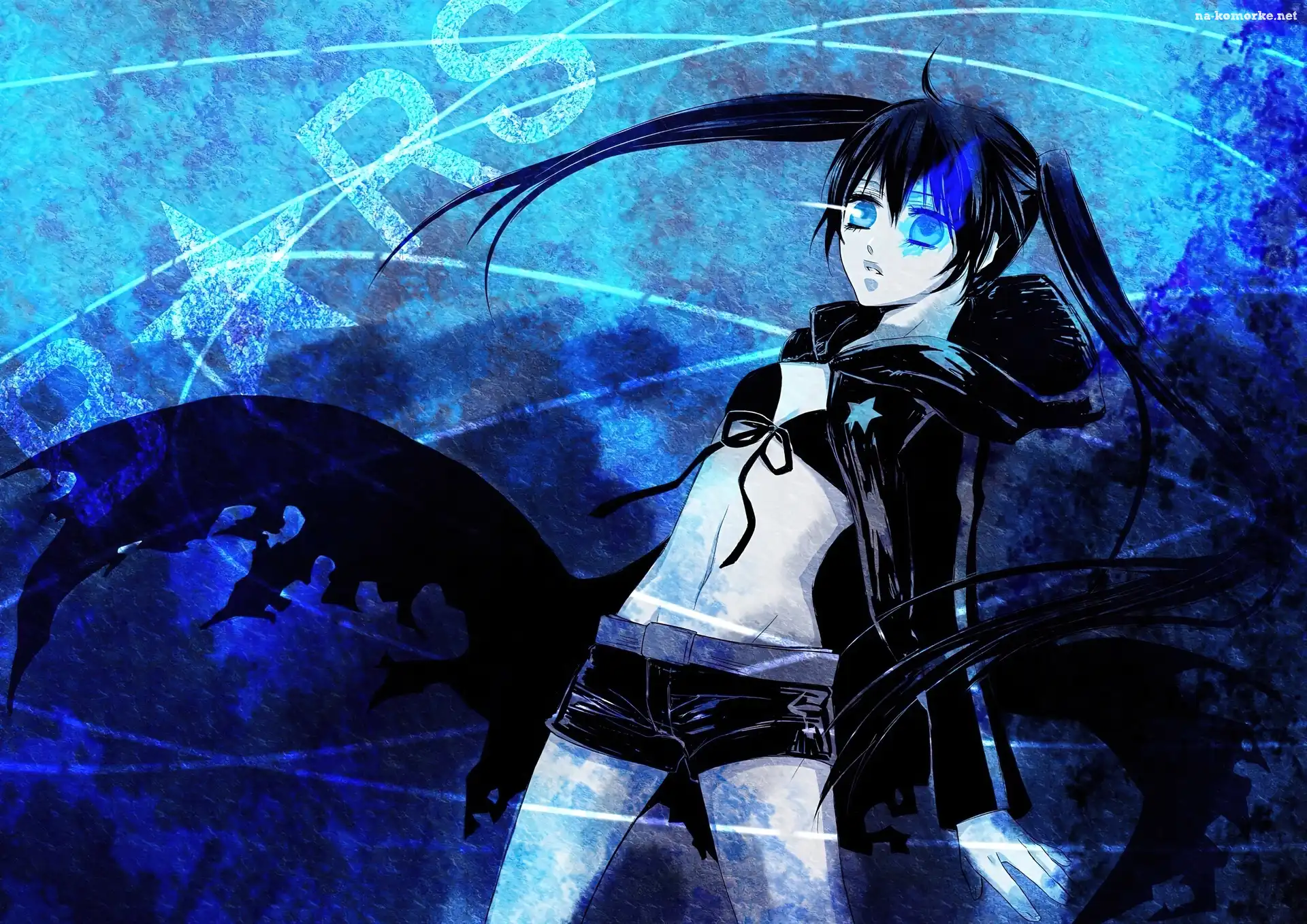Black Rock Shooter, Płaszczyk, Spodenki, Stanik Black Rock Shooter, Oko, Planeta Black Rock Shooter, Włosy, Anime, Dziewczyna Black Rock Shooter Łańcuch, Miecz, Black Rock Shooter Black Rock Shooter, Łańcuchy Black Rock Shooter Black Rock Shooter, Miecz Black Rock Shooter, Pasek, Łańcuchy, Wieżowce Black Rock Shooter Dziewczyna, Woda, Black Rock Shooter