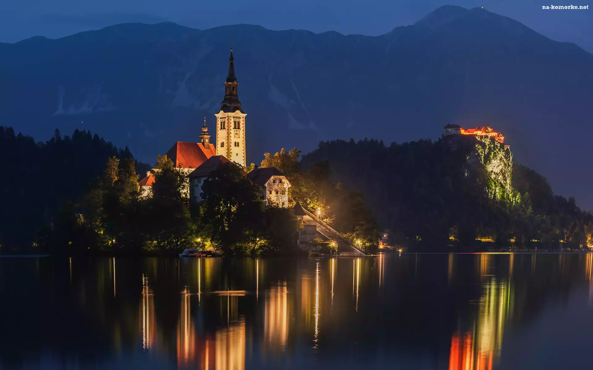 Kościół, Góry, Słowenia, Odbicie, Noc, Światła, Jezioro Bled na Komórkę