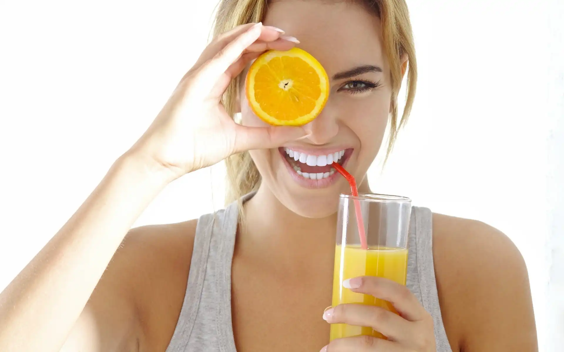 Blondynka, Pomarańczowy, Uśmiechnięta, Sok na Komórkę