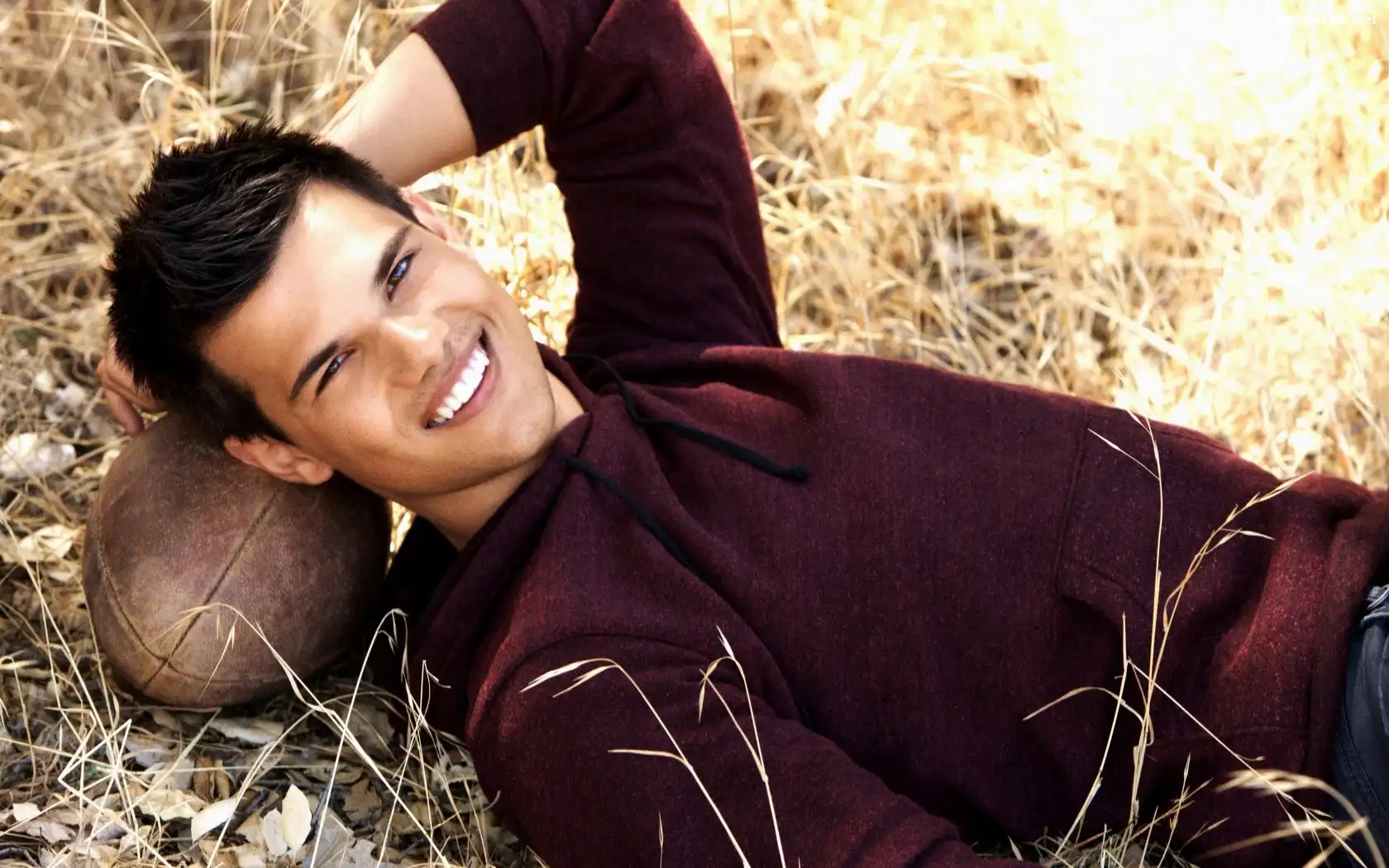 Taylor Lautner, Spojrzenie Bluza, Taylor Lautner, Uśmiech, Piłka, Trawa Taylor Lautner