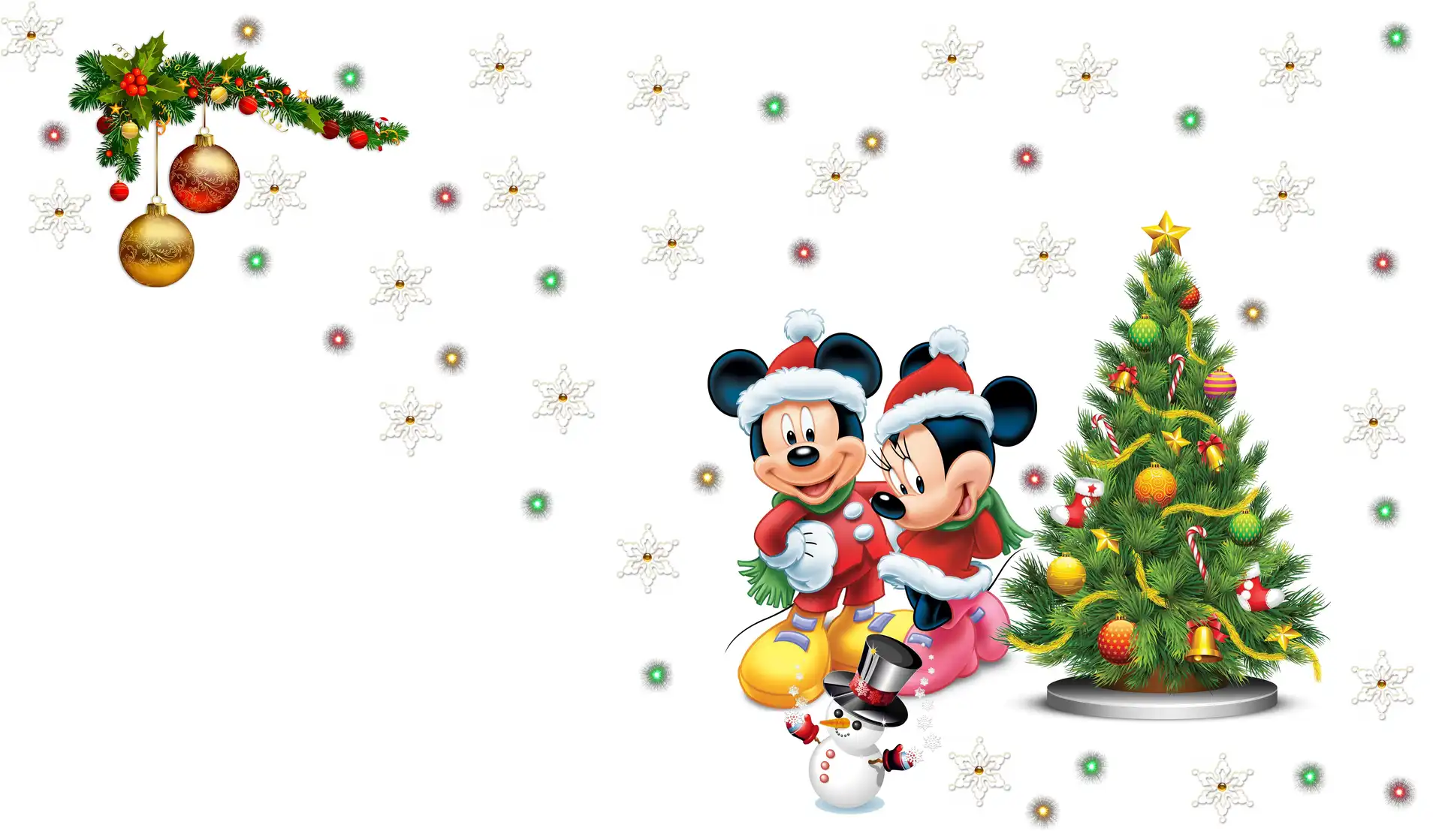 Choinka, Myszka Miki, Stroik, Bałwanek, Tło, Minnie, Białe, Gwiazdki, Bombki na Komórkę