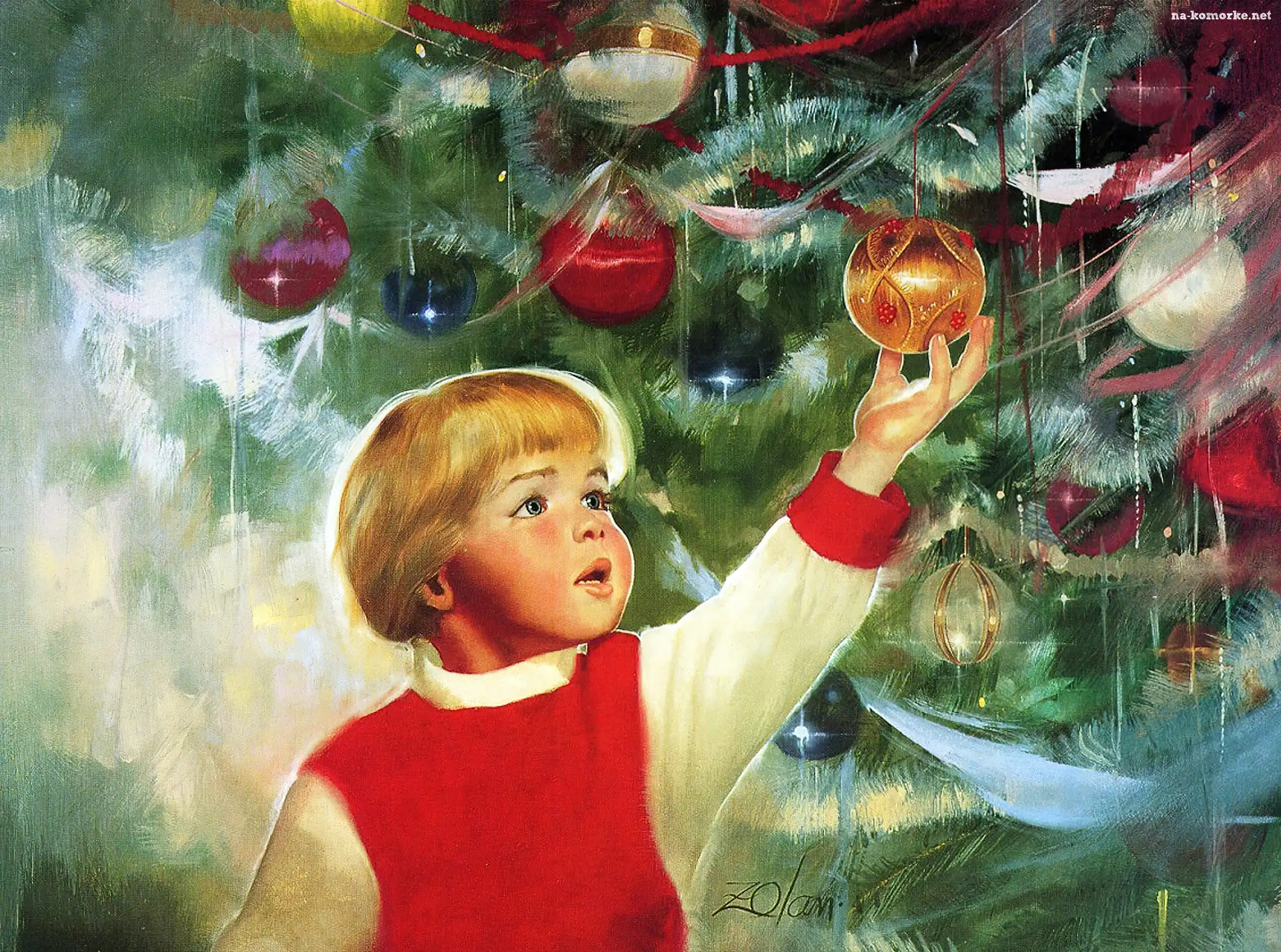Obraz, Dziecko, Choinka, Donald Zolan, Bombki na Komórkę