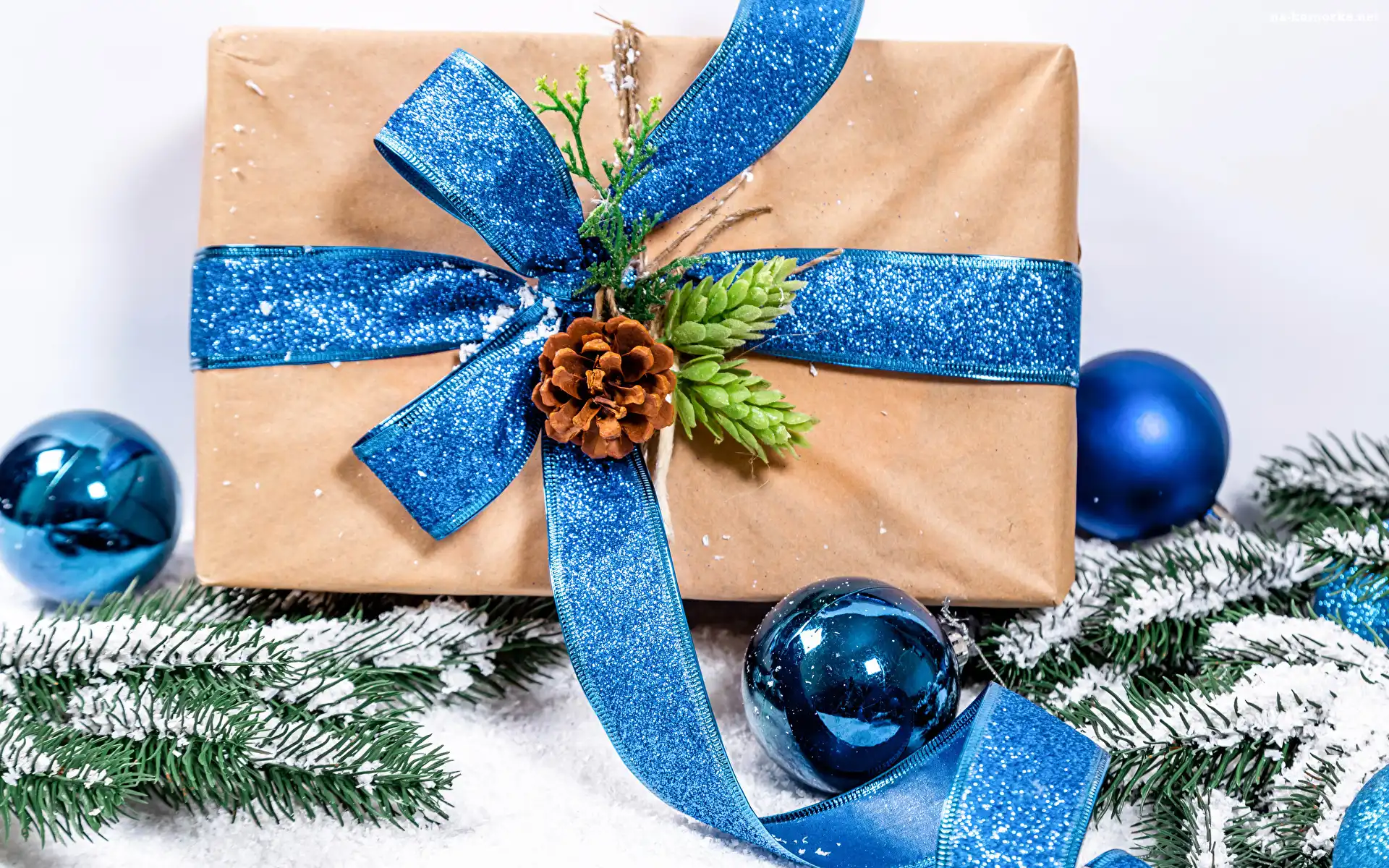Prezent, Bombki, Szyszki, Niebieska, Kokarda, Gałązki, Świerkowe na Komórkę