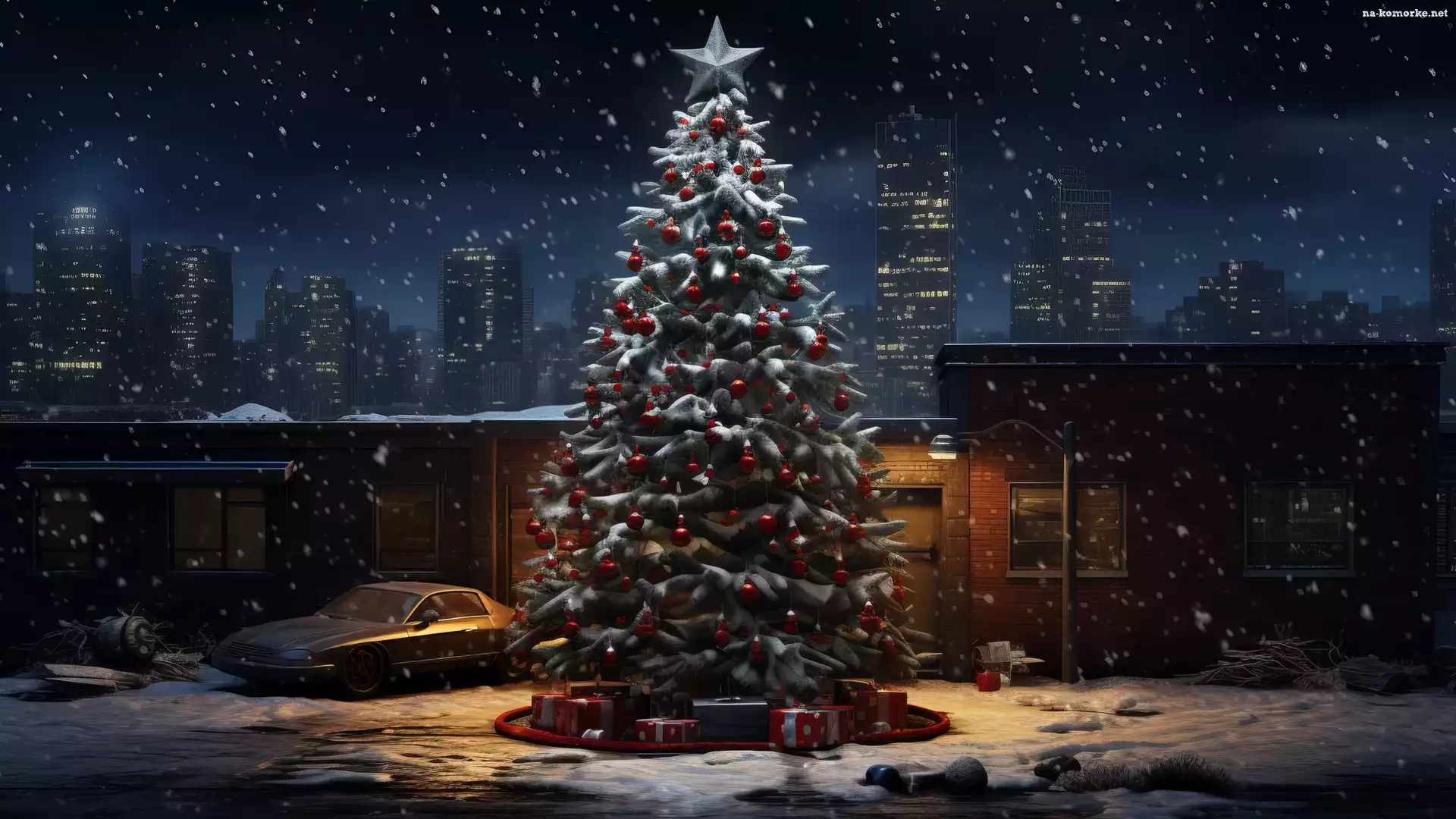 Bombki, Noc, Samochód, Boże Narodzenie, Domy, Śnieg, Prezenty, Choinka na Komórkę
