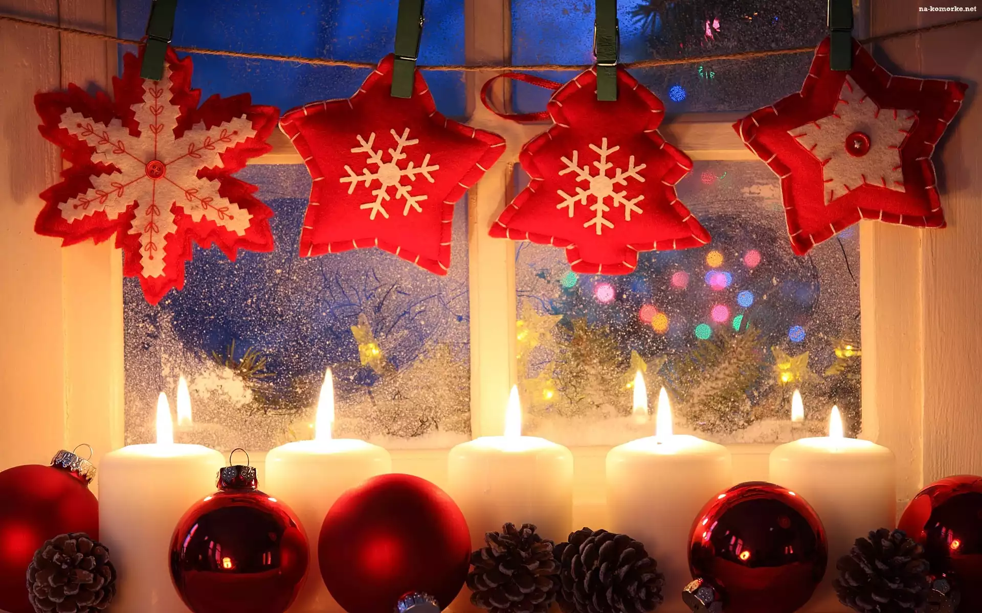 Czerwone, Święta, Dekoracja, Bombki, Białe, Świece, Okno na Komórkę