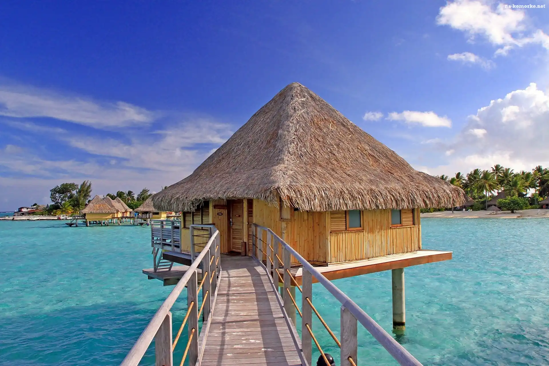 Laguna, Bora Bora, Polinezja Francuska, Palmy, Morze, Domek na wodzie na Komórkę