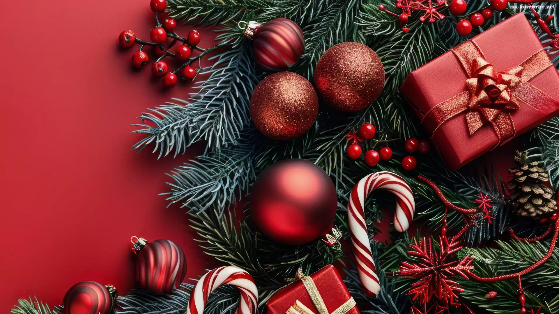 Boże Narodzenie, Jagody, Tło, Lizaki, Bombki, Prezenty, Gałązki, Kompozycja, Czerwone na Komórkę |