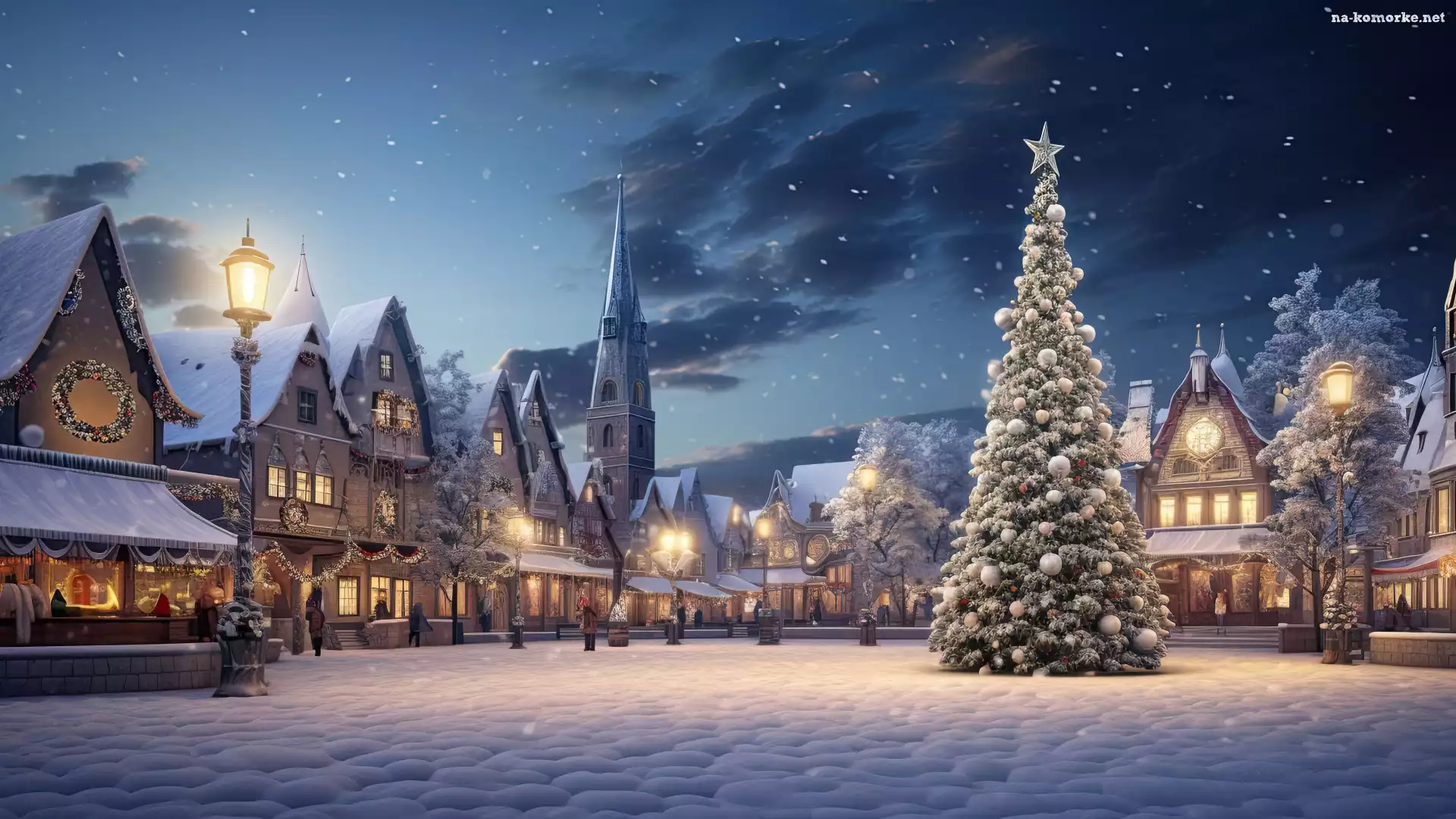Rynek, Miasteczko, Wieża, Domy, Śnieg, Noc, Zima, Światła, Latarnie, Boże Narodzenie, Choinka na Komórkę |