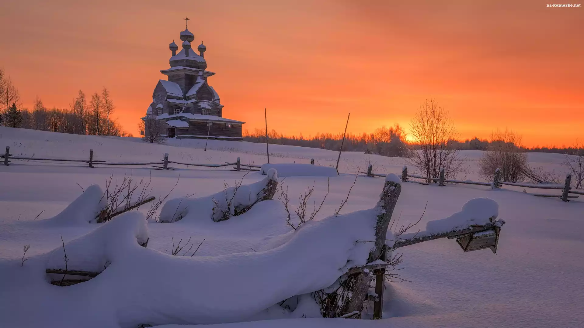 Włodzimierskiej Ikony Matki Bożej, Obwód archangielski, Drzewa, Żerebcowa Góra, Ogrodzenie, Rosja, Zima, Cerkiew na Komórkę |