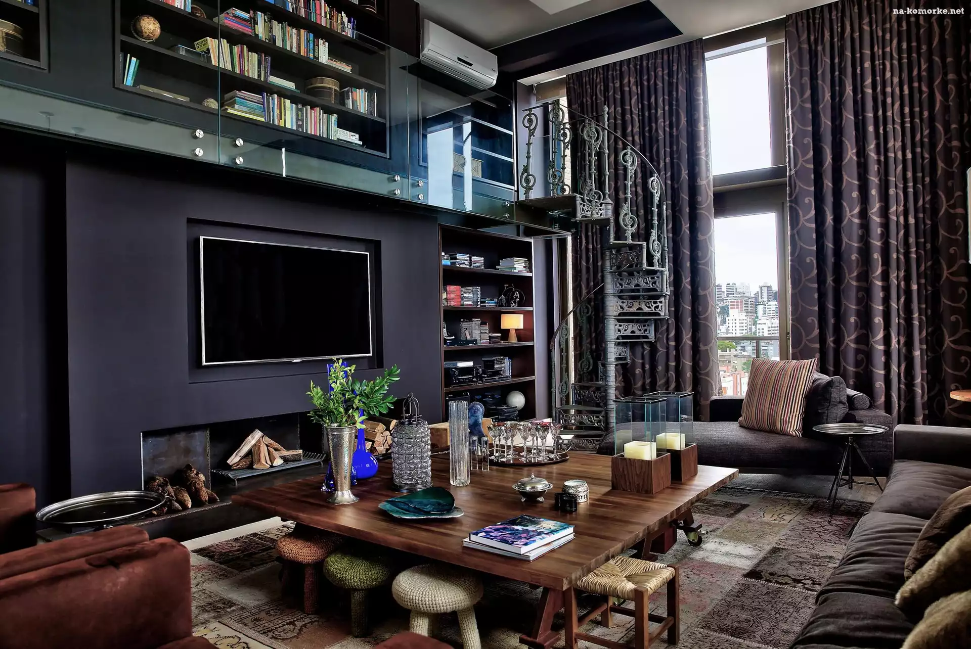 Brązowe, Telewizor, Salon, Schody, Kominek, Kanapy na Komórkę