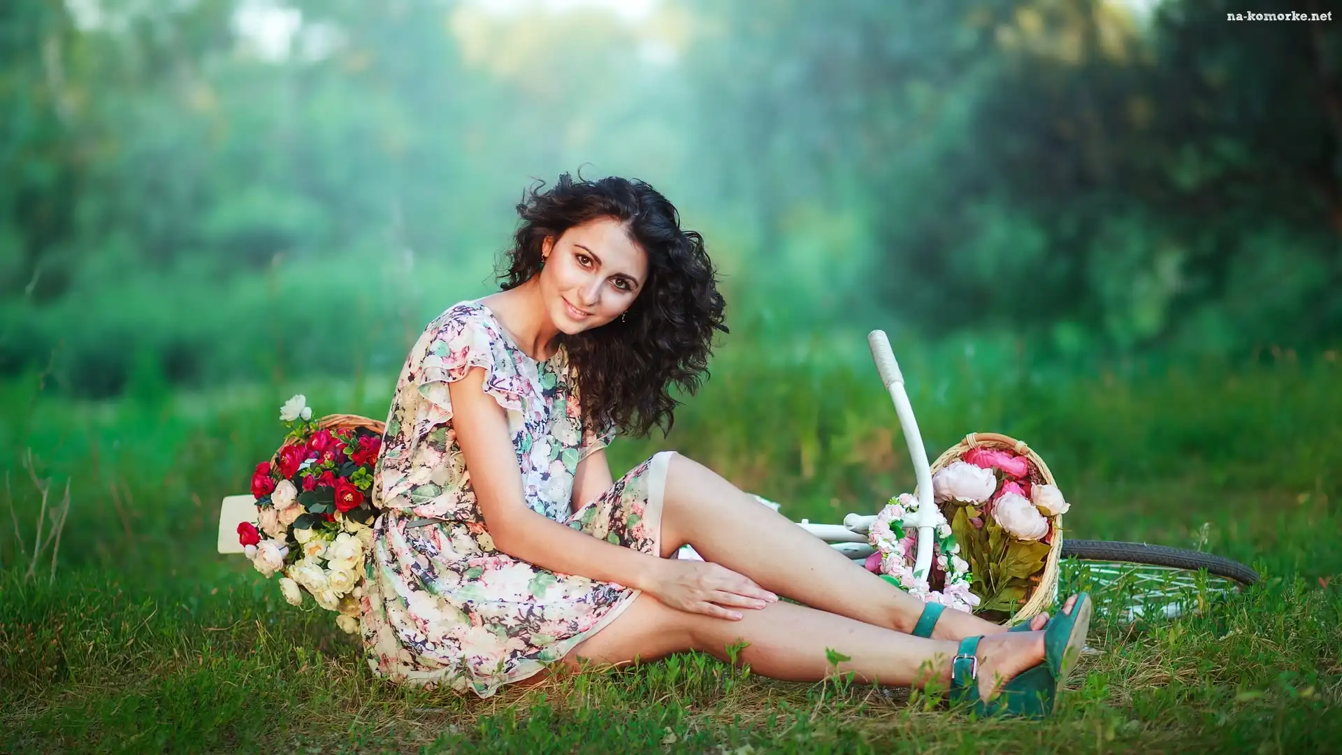 Brunetka, Trawa, Rower, Kwiaty na Komórkę