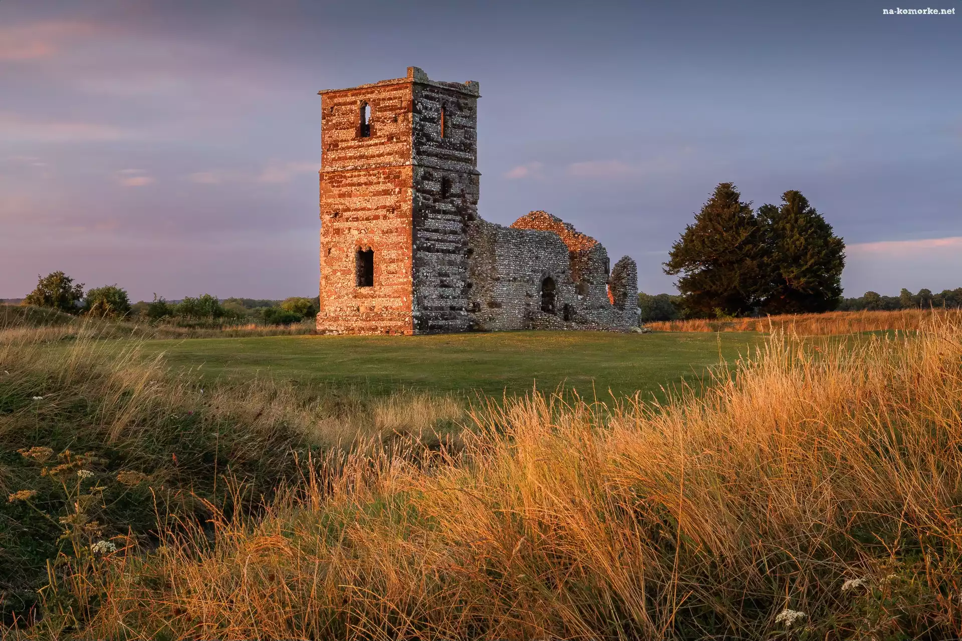 Drzewa, Knowlton Church, Zachód Słońca, Kościół, Wimborne, Anglia, Wielka Brytania, Ruiny, Trawa na Komórkę |