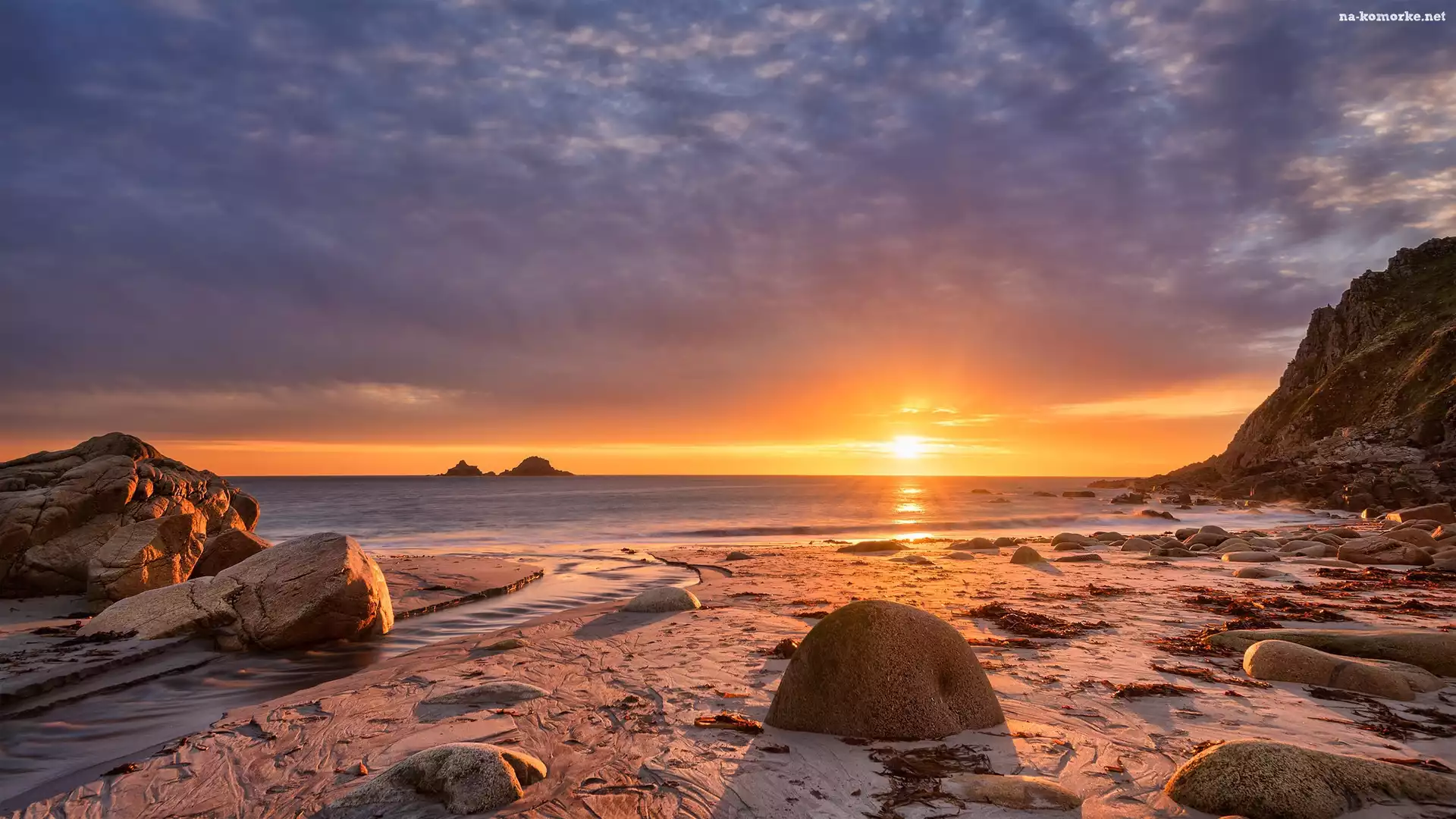 Kamienie, Brzeg, Morze, Chmury, Skały, Wschód słońca na Komórkę