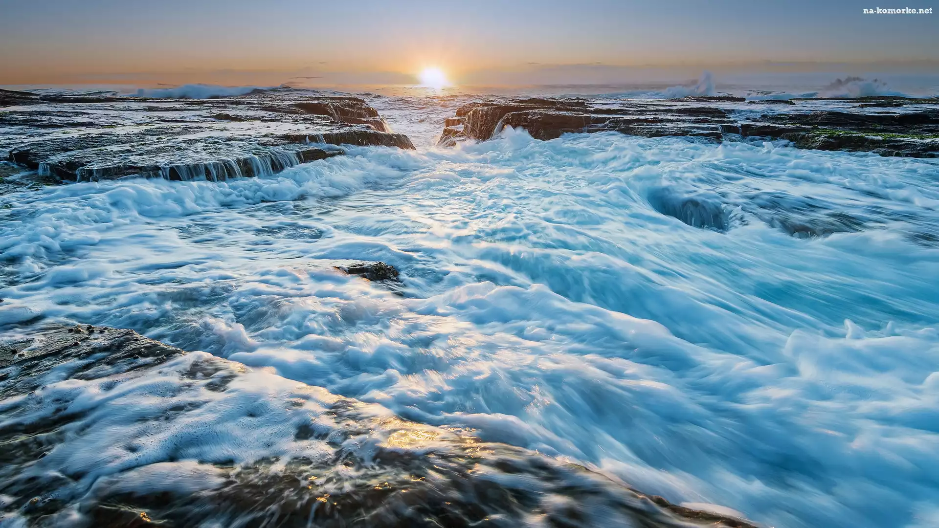 Skały, Morze, Fale, Brzeg, Wschód słońca na Komórkę