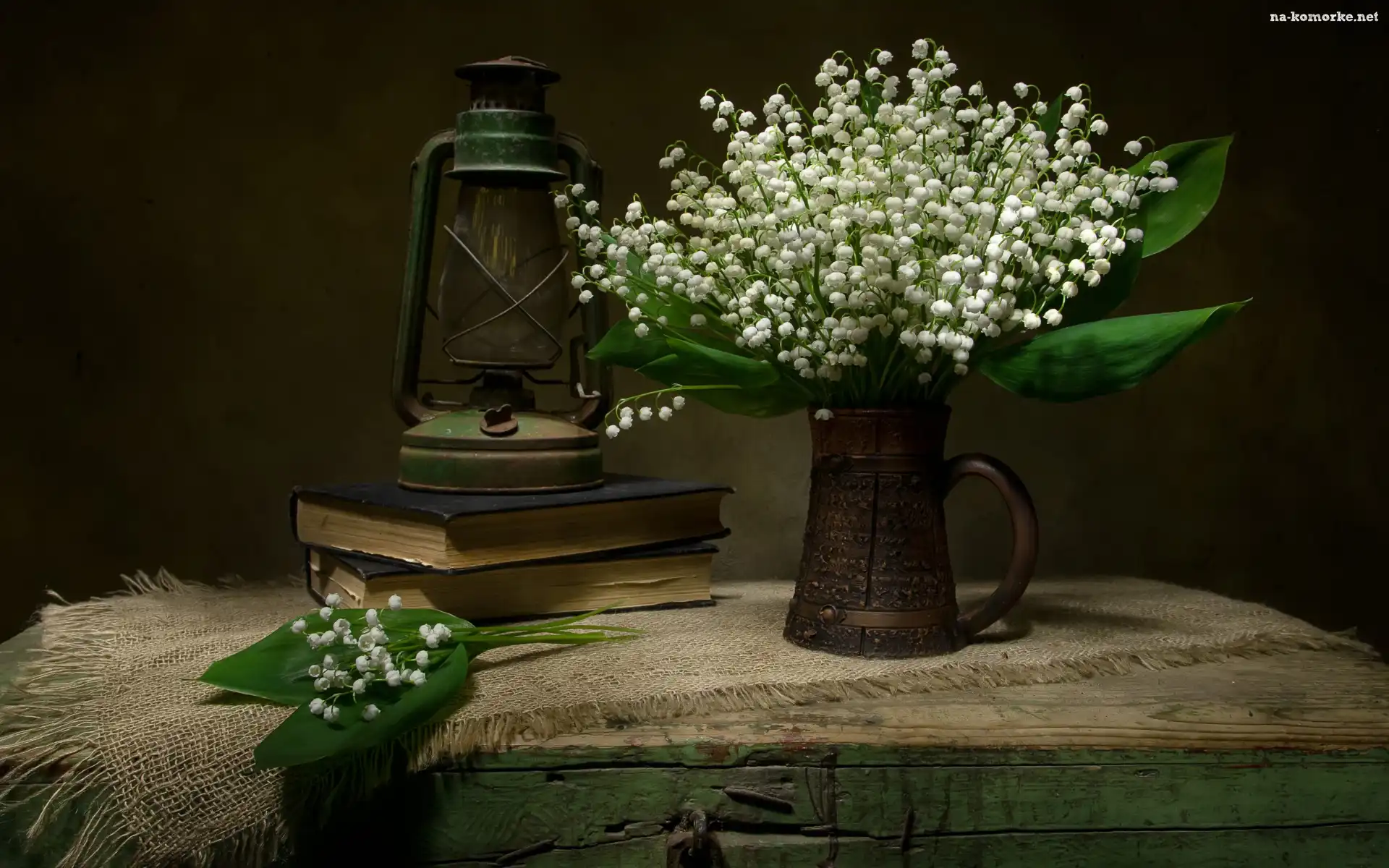 Bukiet, Skrzynia, Książki, Kwiaty, Lampa naftowa, Kompozycja, Dzbanek, Konwalie na Komórkę