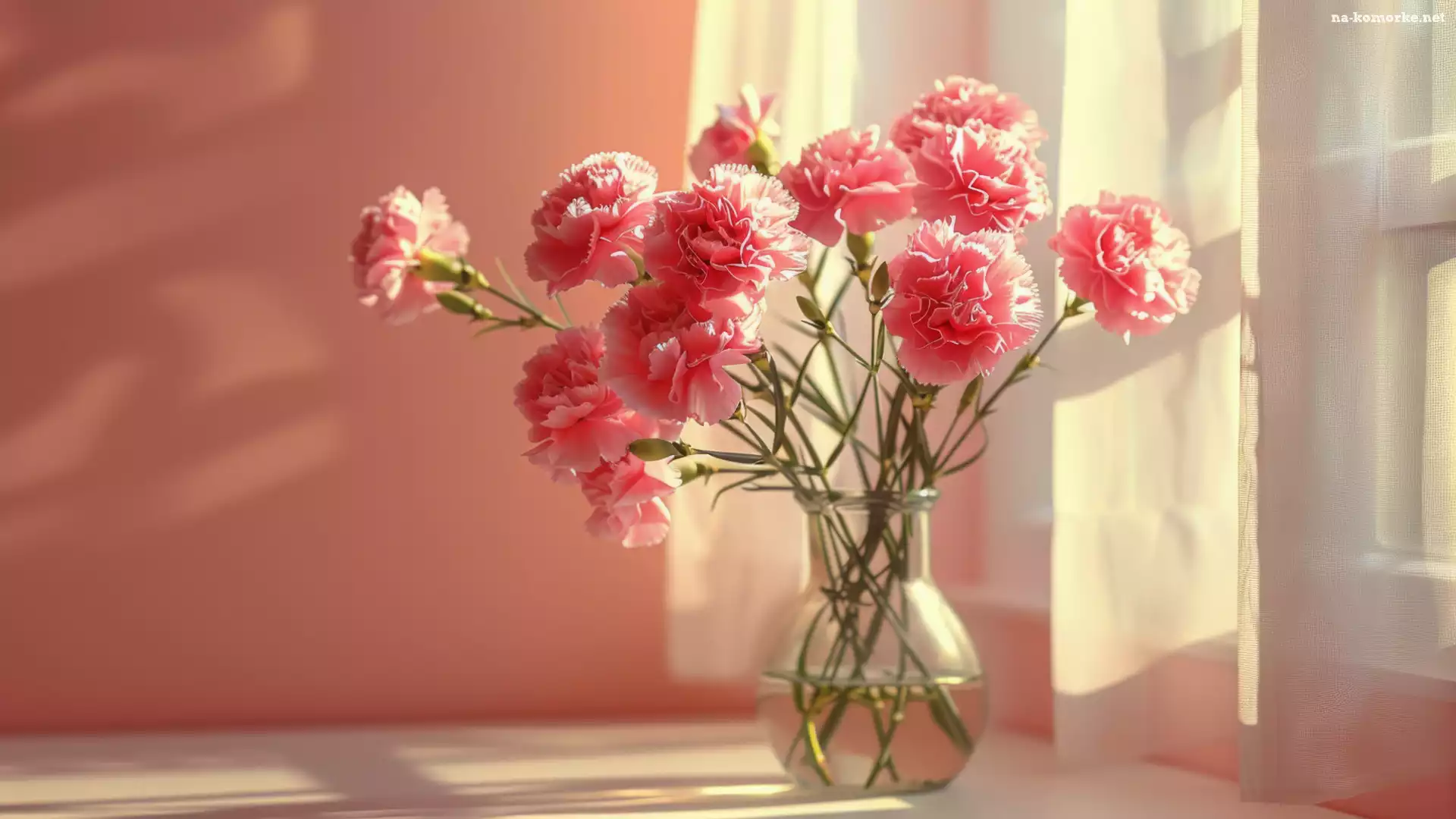 Wazon, Okno, Kwiaty, Przebijające światło, Goździki, Różowe, Bukiet na Komórkę