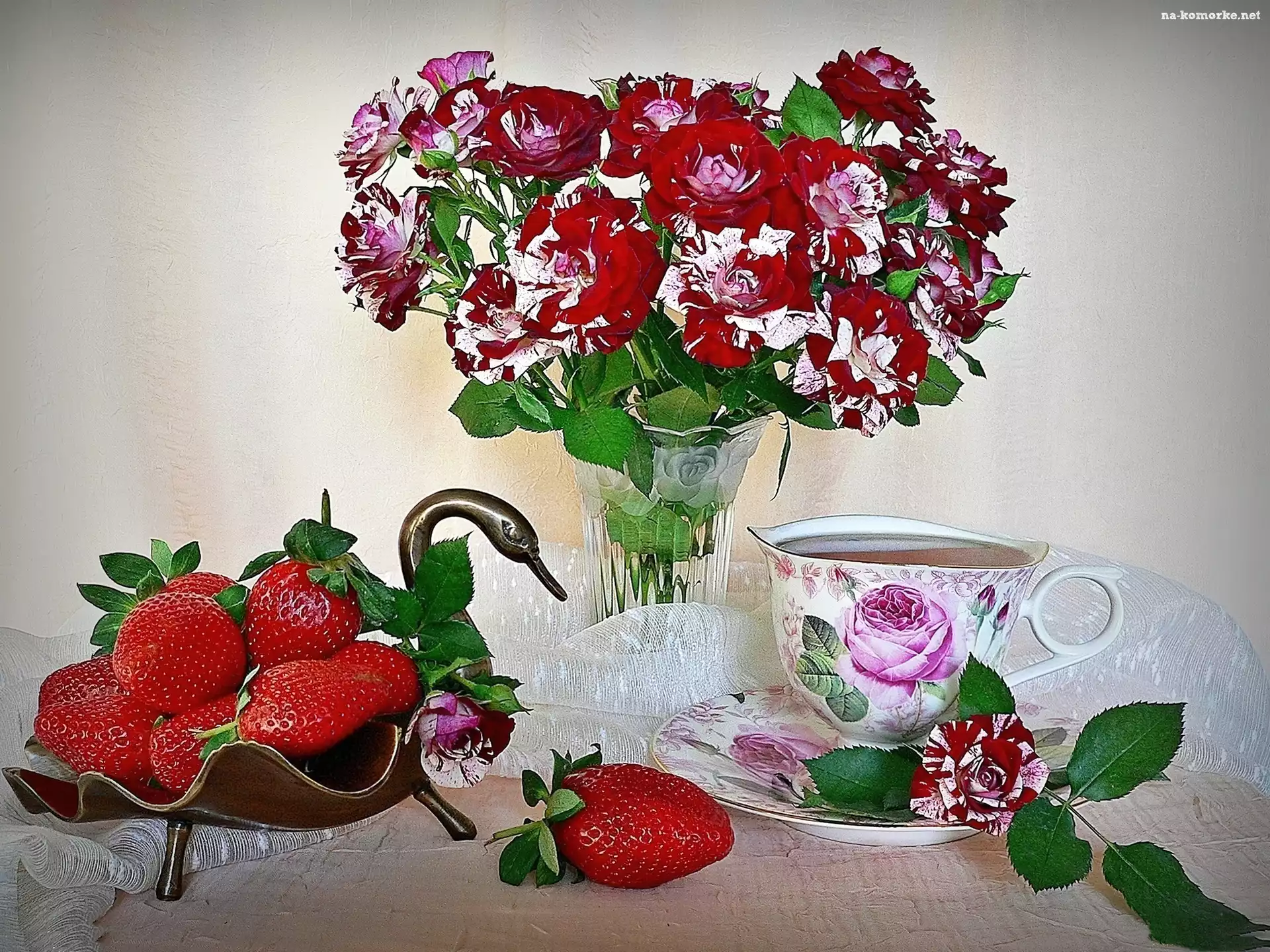 Bukiet, Herbatka, Róż, Truskawki na Komórkę
