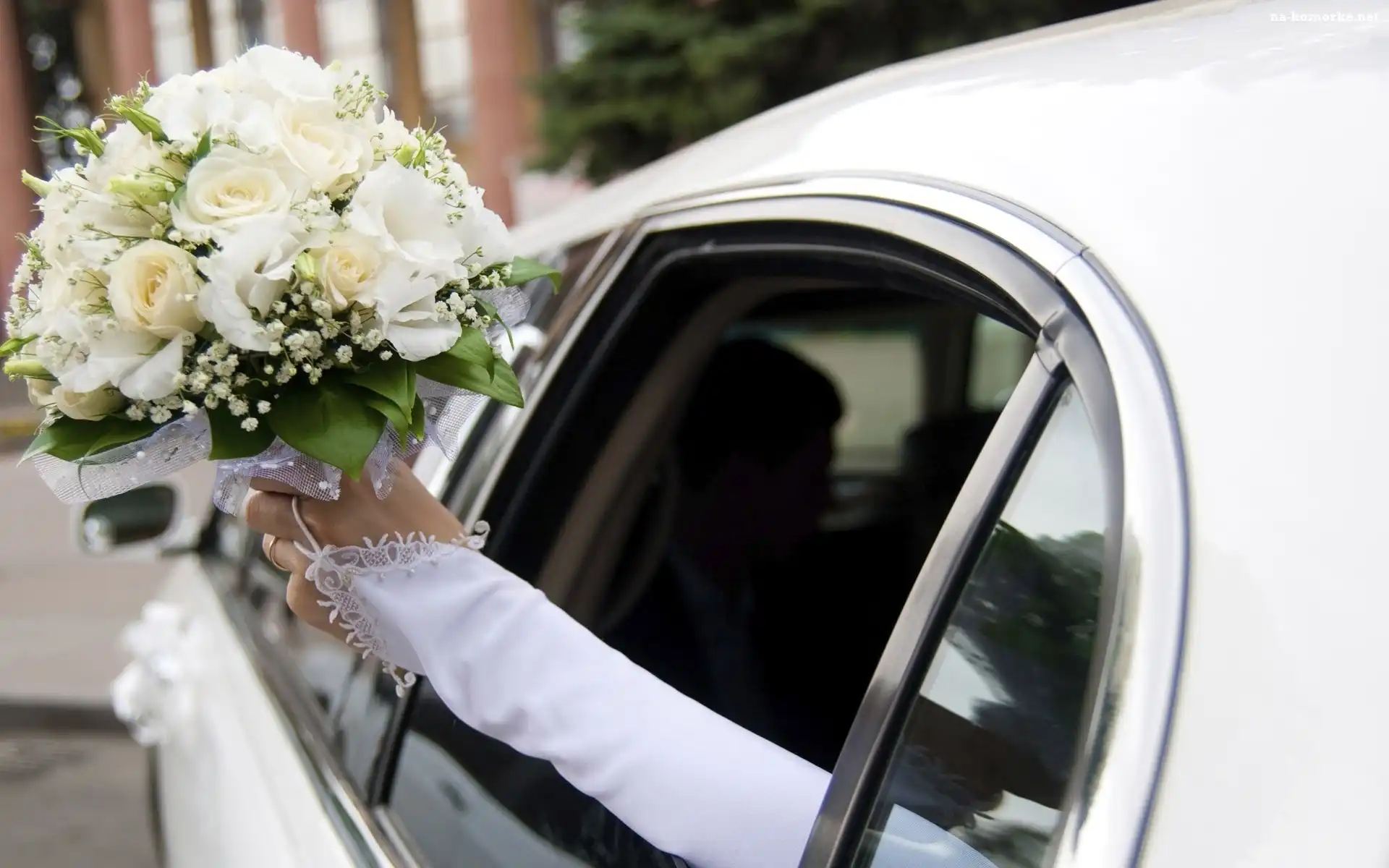Bukiet, Ślub, Samochód, Ręka na Komórkę