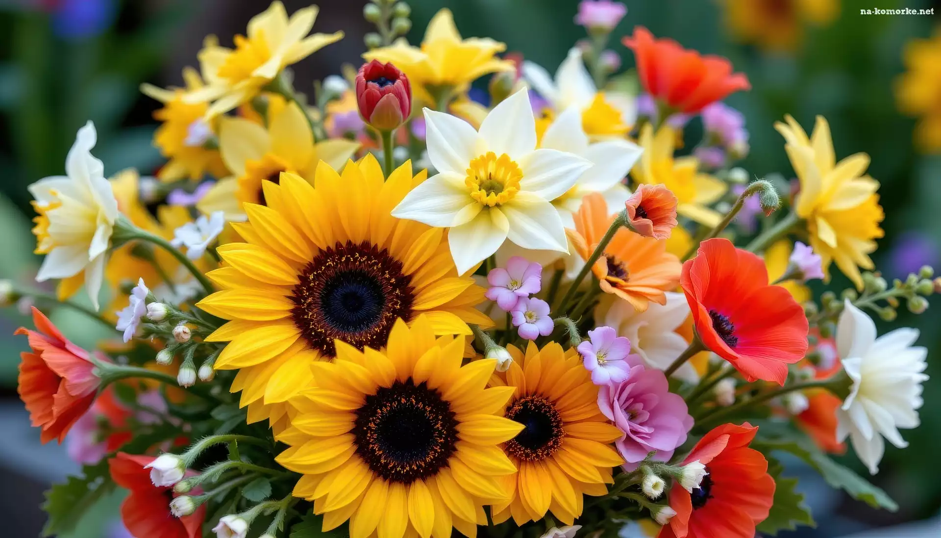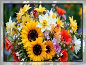 Kolorowy, Kwiaty, Narcyzy, Bukiet, Maki, Słoneczniki na Komórkę
