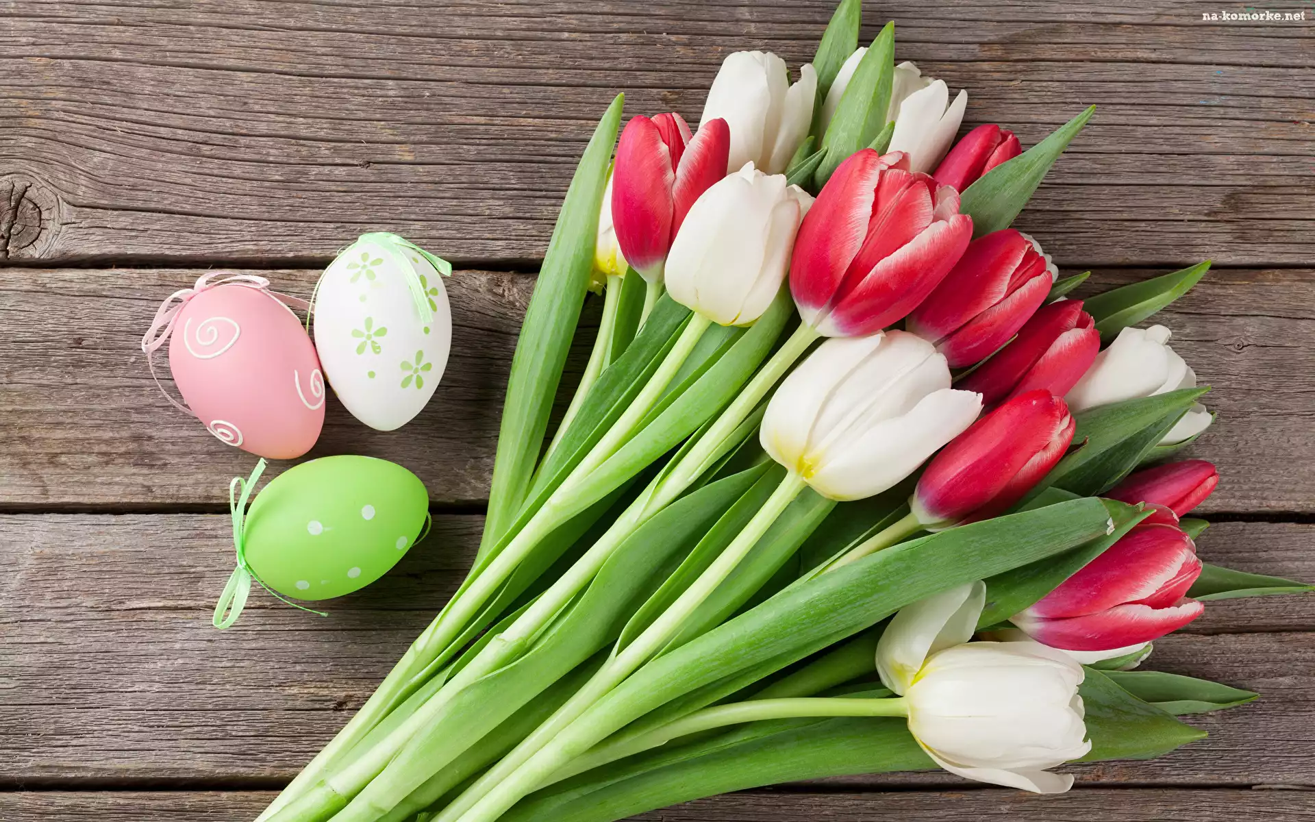 Białe, Pisanki, Tulipany, Kwiaty, Kolorowe, Deski, Czerwone, Bukiet na Komórkę