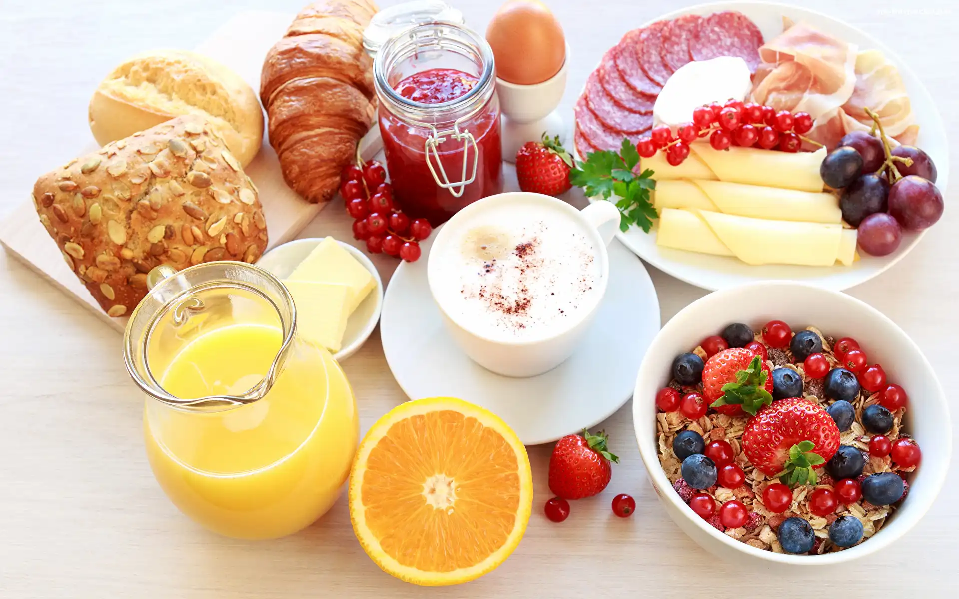 Sok, Śniadanie, Jajko, Musli, Bułki, Dzbanek, Owoce, Ser, Miseczka, Dżem, Wędliny, Talerzyki, Rogale, Kawa na Komórkę |