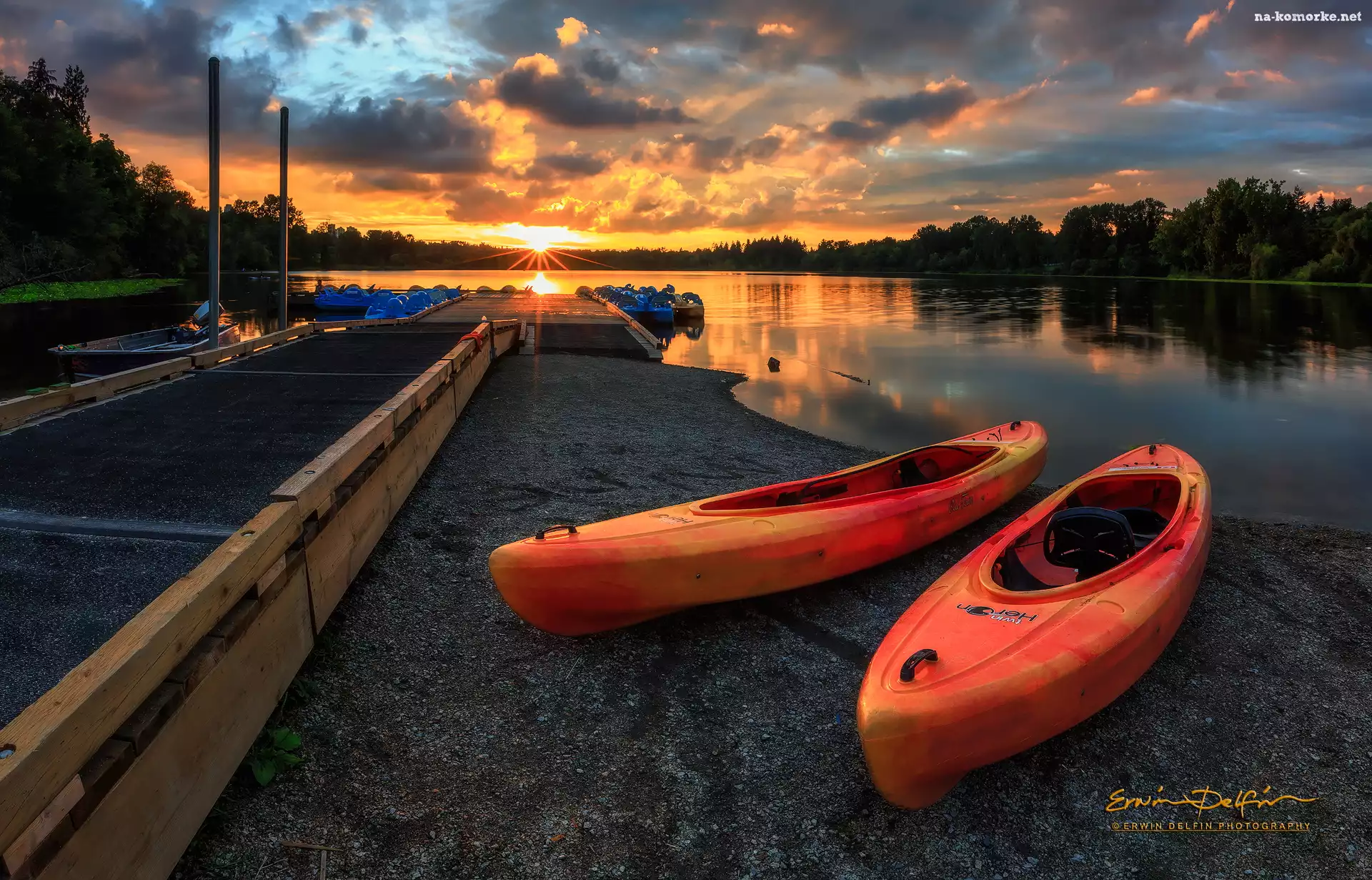 Zachód słońca, Burnaby, Kanada, Przystań, Kajaki, Jezioro Deer, Deer Lake Park na Komórkę