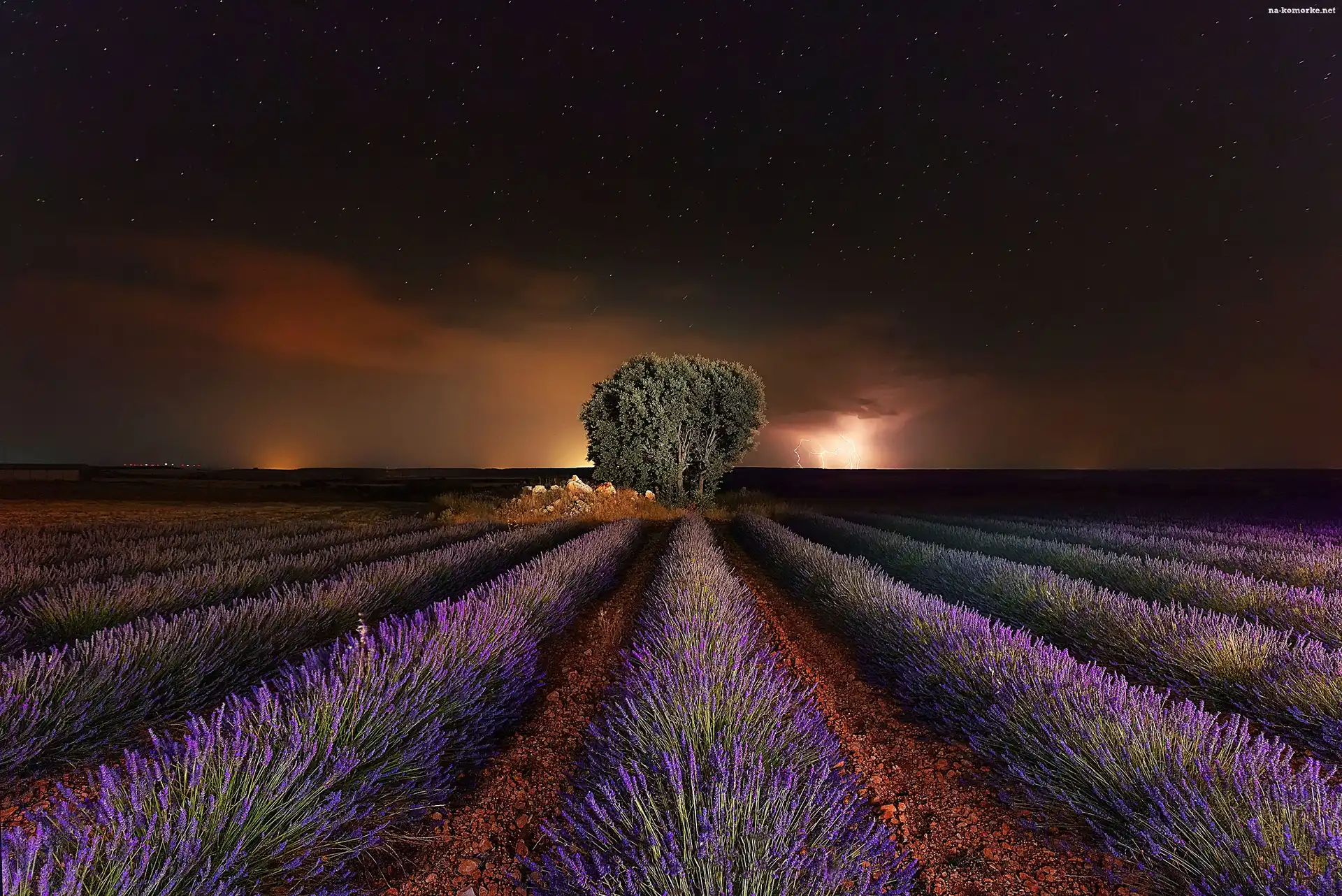 Burza, Pole, Drzewo, Gwiazdy, Lawenda, Noc na Komórkę