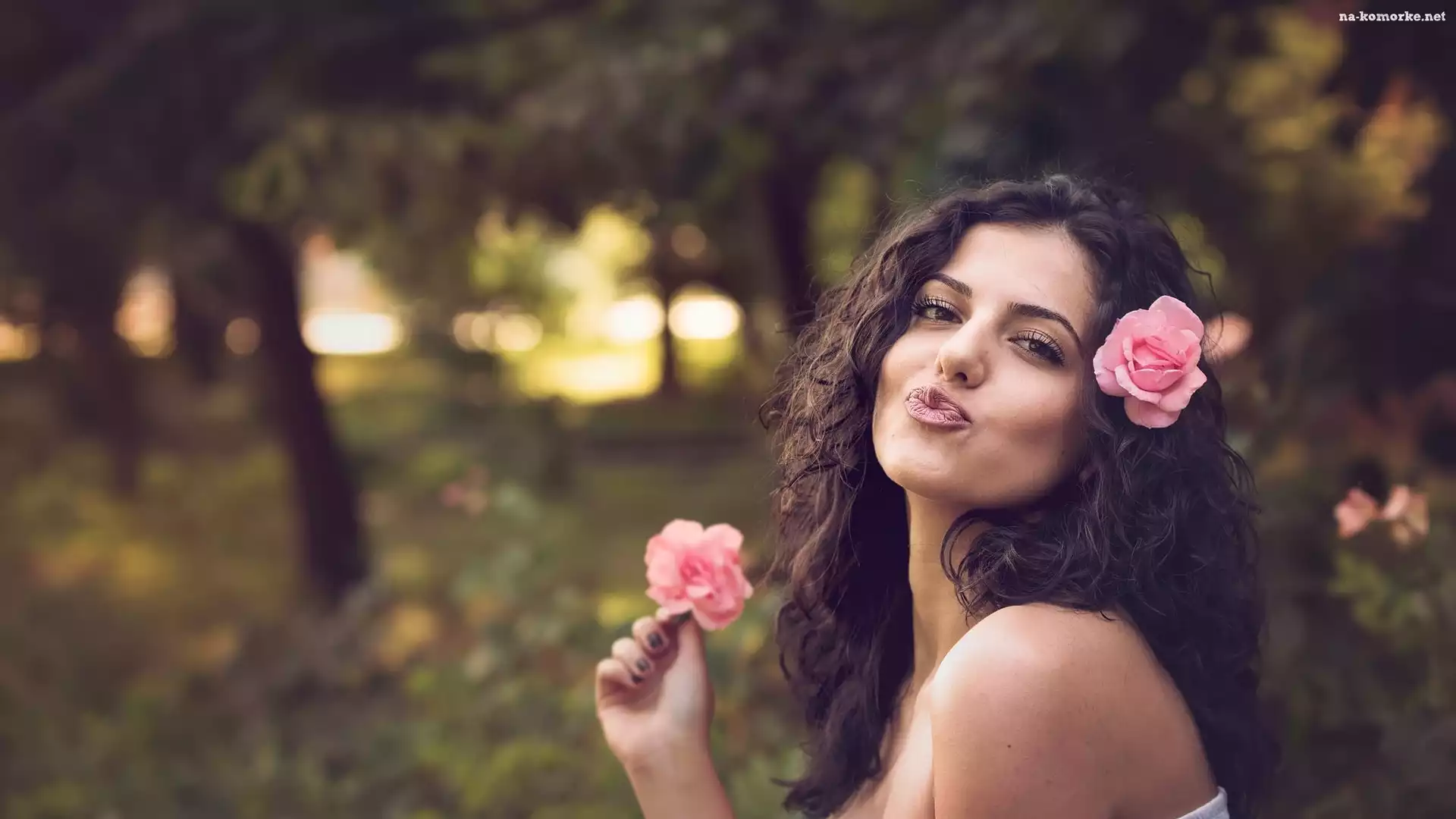 Szatynka, Buziak, Całus, Kręcone, Włosy, Kwiat, Róża na Komórkę